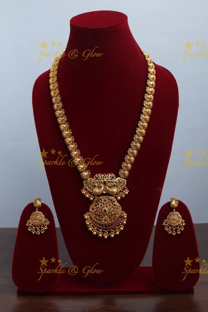 Indulge in the exquisite beauty of the Peacock Carved Long Necklace with Gold Beads, a masterpiece that embodies elegance and tradition. This stunning piece showcases intricately carved peacock motifs, a symbol of grace and beauty, set against a backdrop of shimmering gold finish. The necklace is adorned with lustrous gold beads, adding a festive charm that makes it perfect for weddings and special occasions.