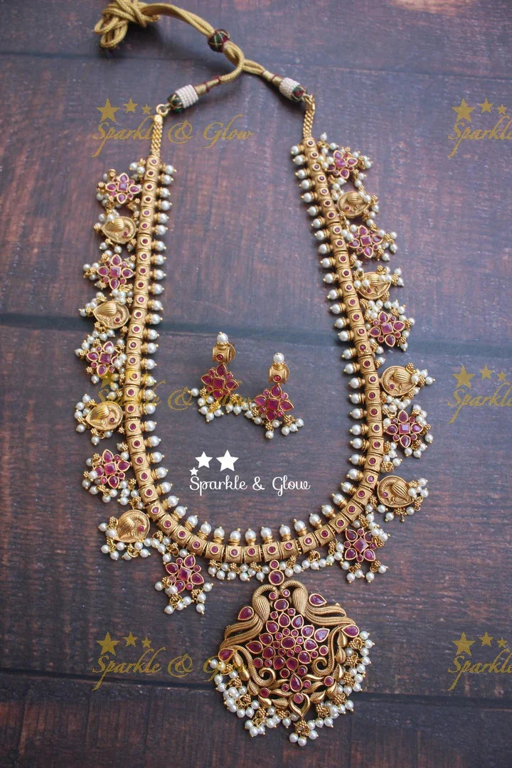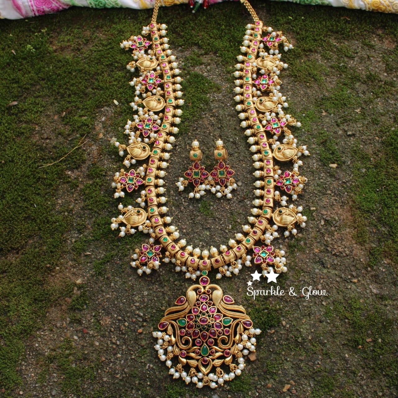 The gutta pusalu design, characterized by its cascading clusters of pearls, adds a touch of regal sophistication. Perfect for weddings and festive occasions, this necklace is sure to be the centerpiece of your ensemble.