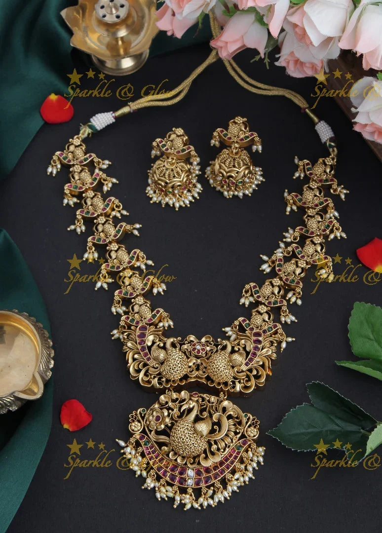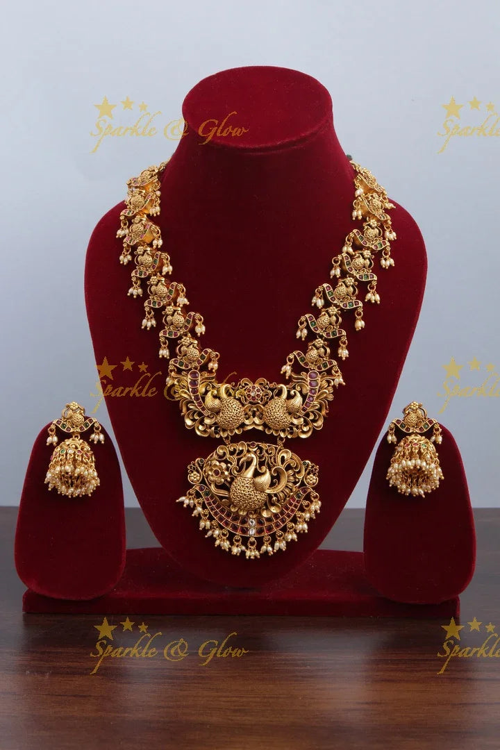 Embrace the elegance of tradition with our Peacock Kemp Stone Pearl Necklace, an exquisite piece perfect for festive and wedding occasions. This intricately carved necklace features majestic peacock motifs adorned with vibrant kemp stones, set against a rich gold finish that captures the essence of opulence. The delicate rice pearls add a touch of grace, making this short necklace a statement piece for any celebration.