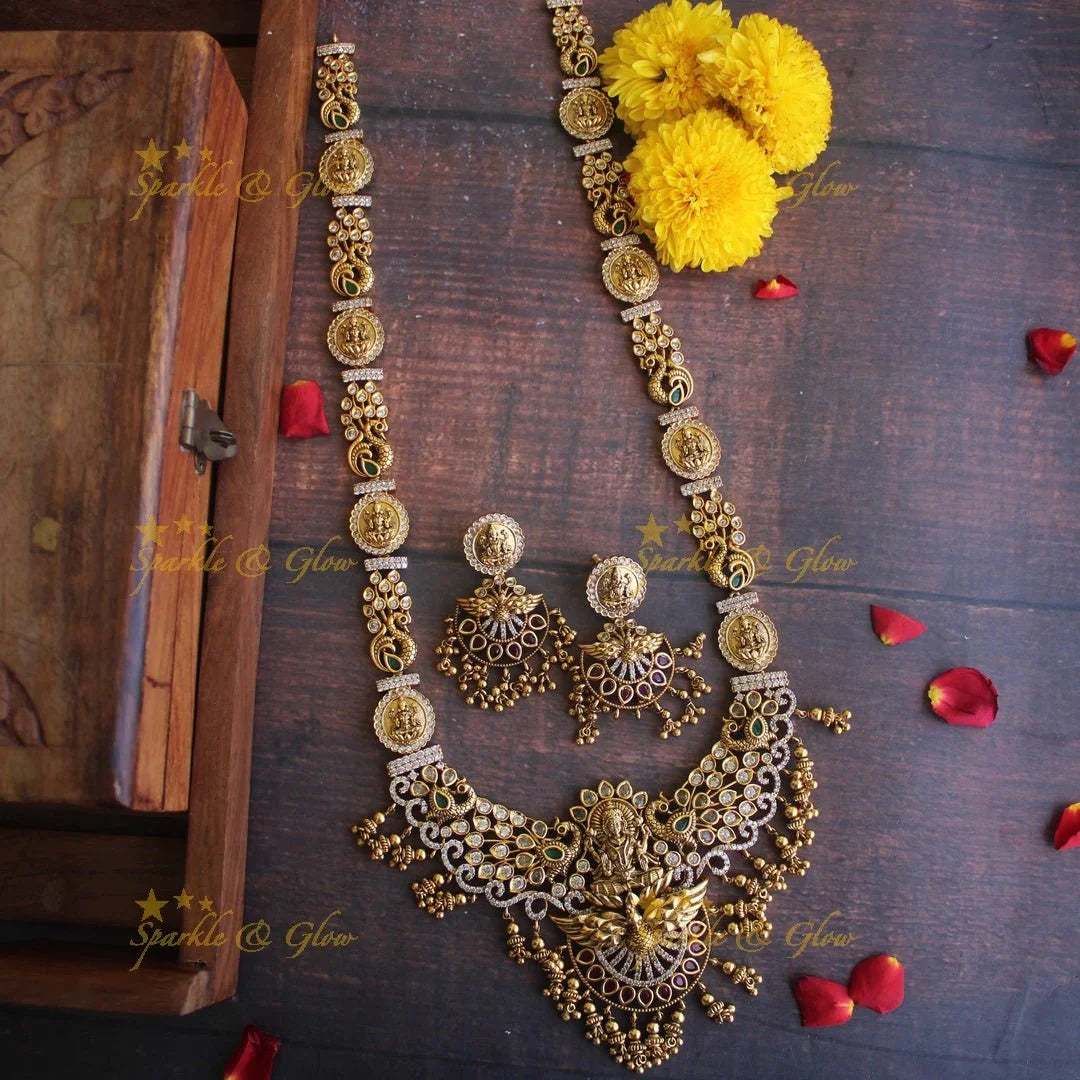 Adorn yourself in the opulence of tradition with our Peacock & Lakshmi CZ Haram in Antique Gold Finish. This exquisite piece captures the essence of Indian heritage with its intricate carvings and captivating design. The haram showcases detailed peacock and Lakshmi motifs, symbolizing grace and prosperity, set in a stunning antique gold finish. Adorned with shimmering cubic zirconia stones and elegant beads, this piece is perfect for festive occasions and weddings.