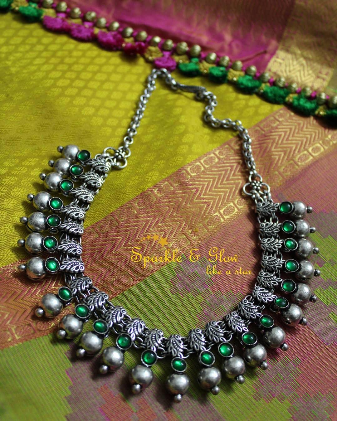 Embrace the charm of tradition with our exquisite Peacock Oxidised Silver Necklace with Green Stones. This short necklace, adorned with intricate peacock motifs and lustrous green stones, is a true testament to timeless elegance. The oxidised silver finish enhances its vintage appeal, making it perfect for both festive occasions and dailywear.