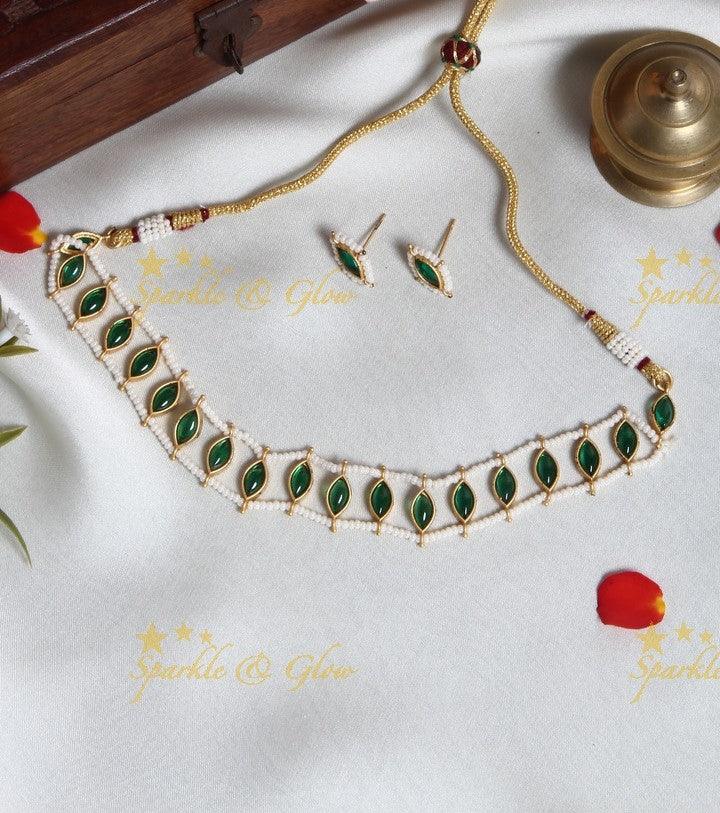 Discover elegance with our Pearl Cluster Bindi Stone Choker in a captivating green hue. This exquisite high-neck choker features a stunning bindi design, seamlessly blending traditional motifs with a modern twist. The lush green stones are elegantly outlined by a delicate cluster of shimmering pearls, all set in a luxurious gold finish.