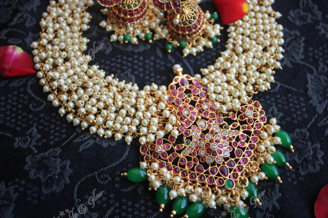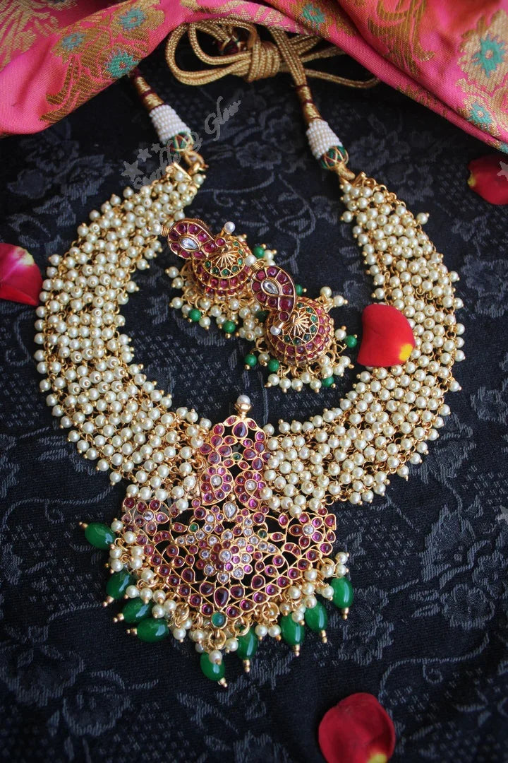Elevate your festive ensemble with the exquisite Pearl Cluster Kemp Stone Necklace. Adorned with lustrous pearls and vibrant kemp stones, this necklace is a testament to elegance and tradition. The intricate gold finish adds a regal touch, while the green and red hues bring out the festive spirit.
