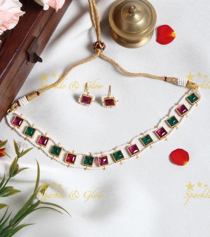 Elevate your festive ensemble with our Pearl Cluster Square Stone Choker - Pink & Green. This exquisite piece showcases a harmonious blend of elegance and tradition, perfect for weddings or special celebrations. The choker features vibrant pink and green square stones, meticulously arranged and outlined by delicate pearl clusters, all set against a lustrous gold finish. Its high-neck design adds a regal touch, making it an ideal choice for those who appreciate intricate craftsmanship.