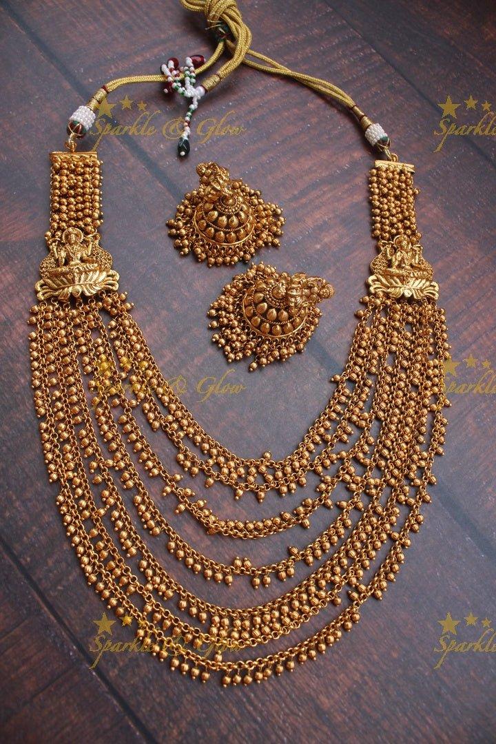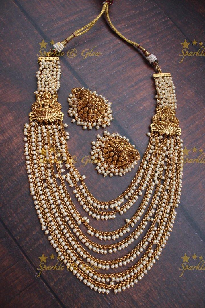 Discover the epitome of elegance with our Pearl Lakshmi Haram - Elegant Layered Design, a stunning piece that exudes traditional charm. This exquisite long necklace showcases intricate gold motifs with layers of delicate pearls, embodying the grace of goddess Lakshmi. The haram features a rich gold finish, accentuated by the soft shimmer of pearls, making it a perfect choice for festive occasions or weddings.