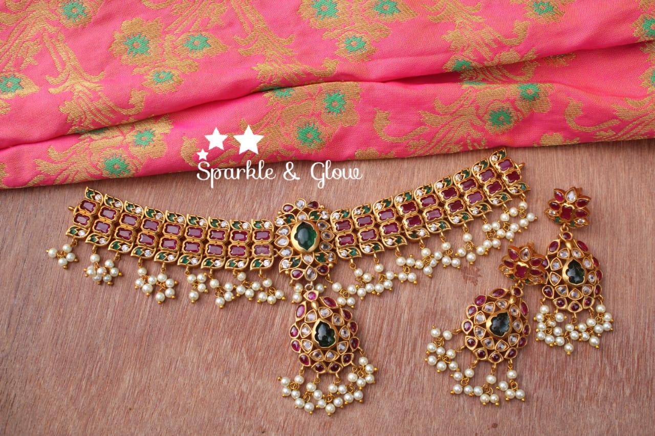 Embrace the elegance of traditional Indian craftsmanship with our exquisite Pink Kemp Stones Guttapusalu Choker Necklace. Perfect for festive occasions and weddings, this high-neck choker features a stunning array of pink kemp stones set in a lustrous gold-alike finish. The intricate design is adorned with delicate pearl-like beads, creating a harmonious blend of richness and grace.
