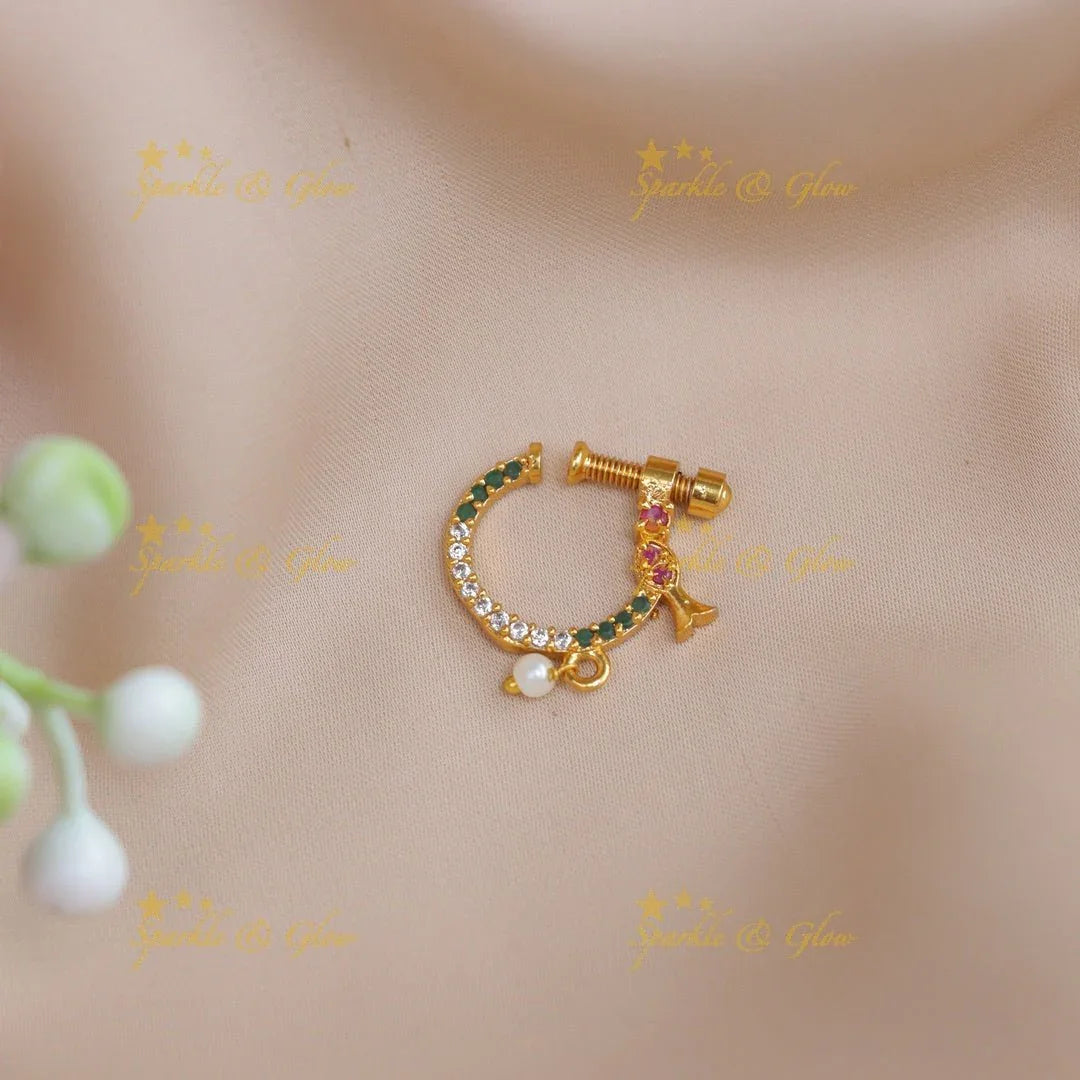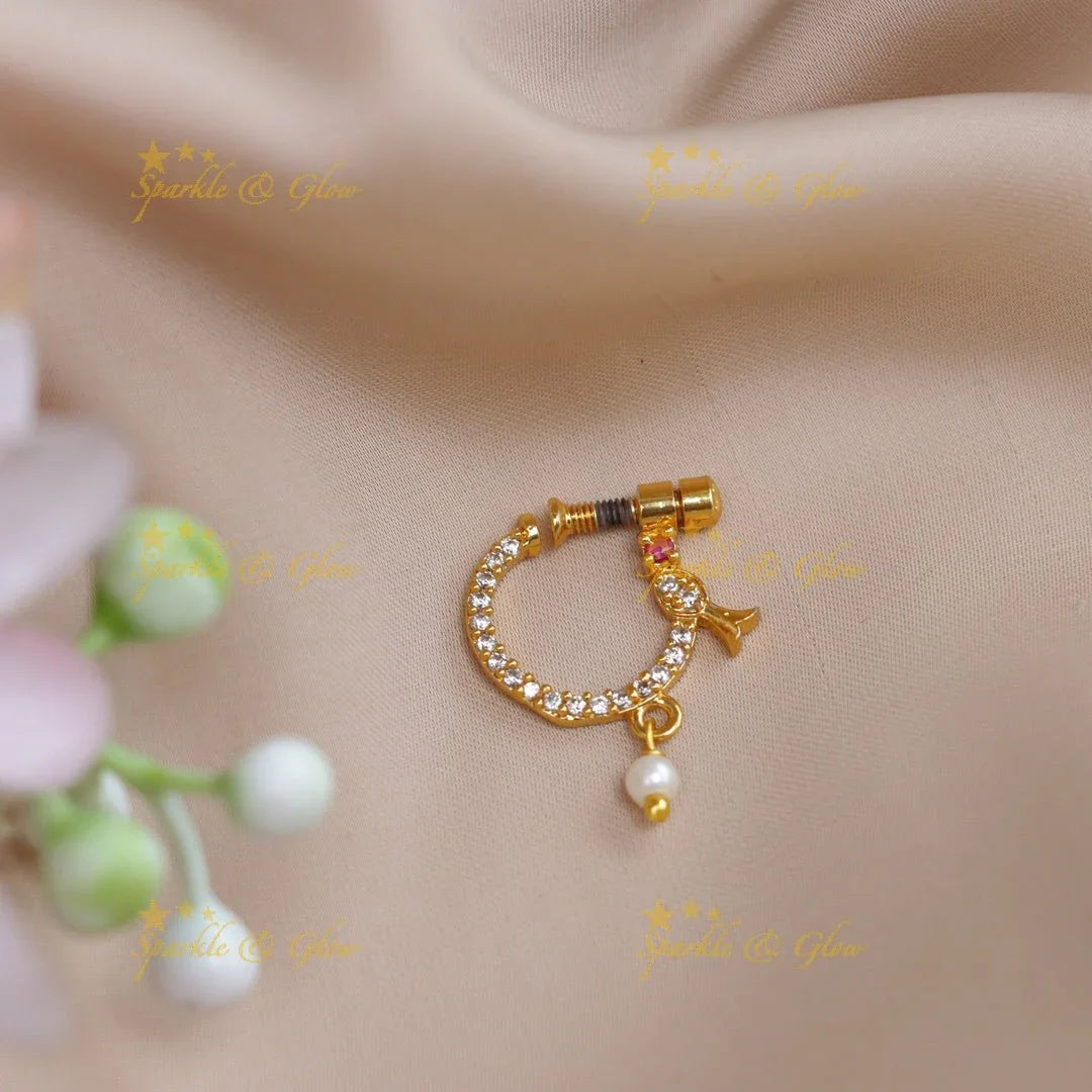 Elevate your festive ensemble with our exquisite Pink & White Fish Design Nose Pin. This stunning piece exudes elegance with its charming fish motif, meticulously crafted in a harmonious blend of pink and white hues. The nose pin is adorned with sparkling stones and delicate beads, set in a lustrous gold finish that captures the light beautifully, adding a touch of glamour to your look.