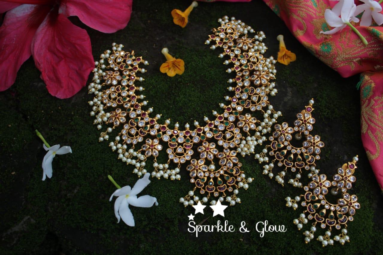 Delicate pearl beads gracefully dangle from the necklace, enhancing its grandeur and charm. Crafted with a luxurious gold finish, this necklace is a testament to impeccable craftsmanship and timeless style, perfect for weddings, festivals, and grand celebrations.