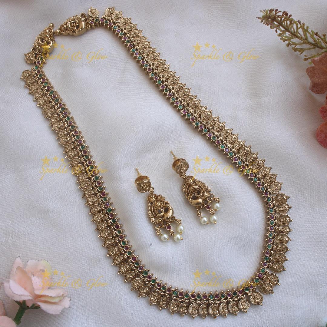 Embrace the elegance of tradition with our Premium Lakshmi Haram, meticulously crafted with exquisite ruby and emerald stones. This stunning piece features intricate peacock coin motifs that reflect a timeless charm, ideal for festive occasions and weddings. The harmonious blend of red and green stones against a lavish gold finish creates a sophisticated allure, while delicate white stones add a touch of purity and grace.