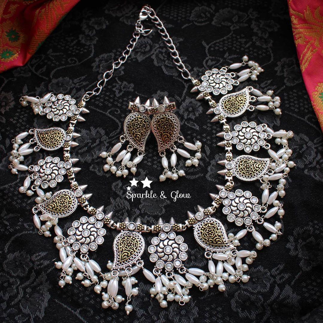 Discover the timeless elegance of our Rice Pearl Gutta Pusalu Necklace crafted in exquisite German silver. This short necklace features a harmonious blend of white and pink hues, adorned with intricate motifs and delicate rice pearl beads. The ornate design reflects traditional craftsmanship, making it a perfect accessory for festive occasions and weddings.
