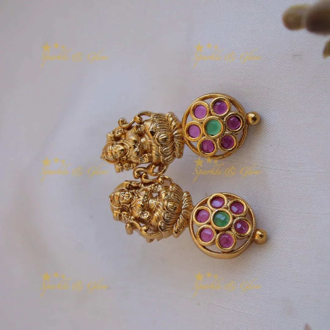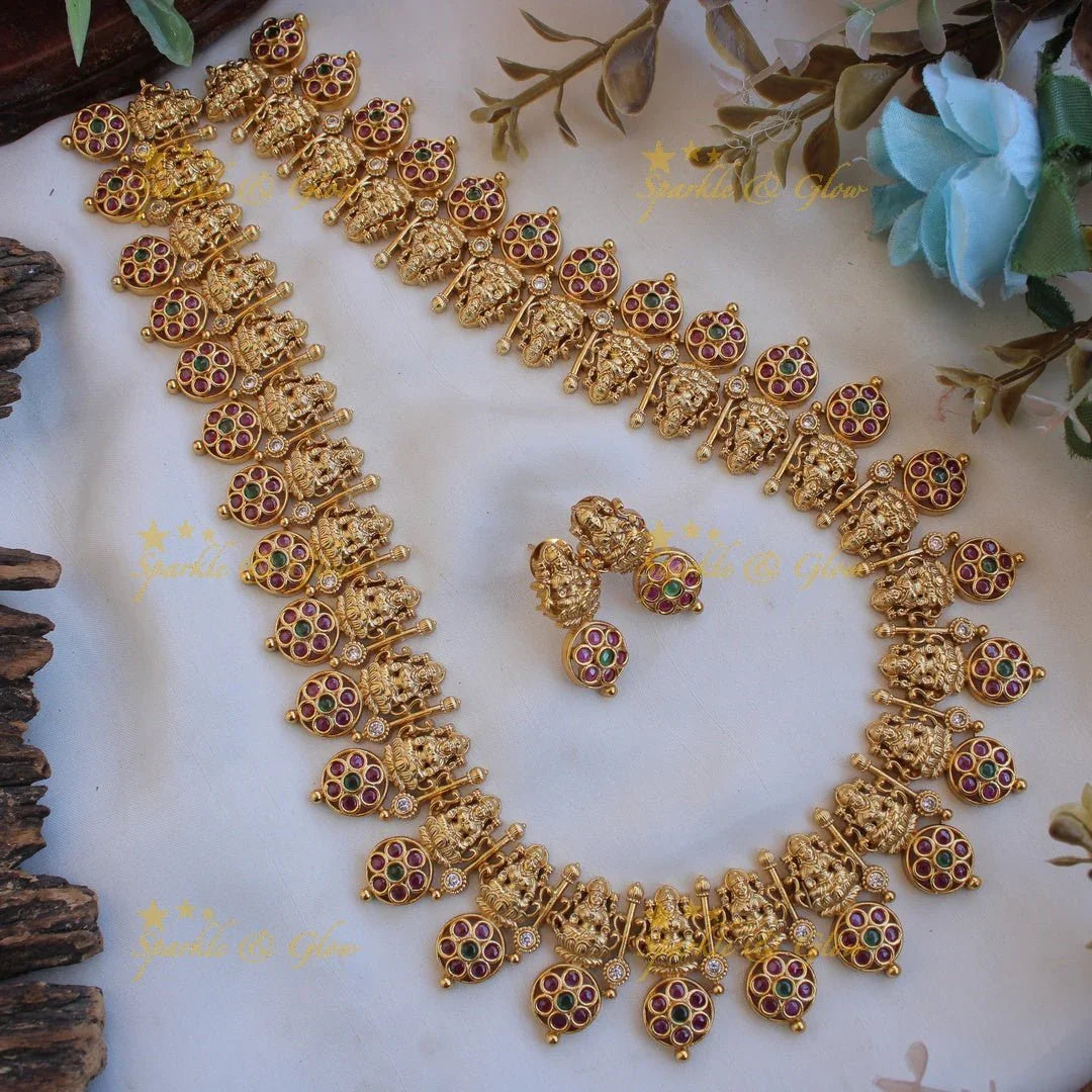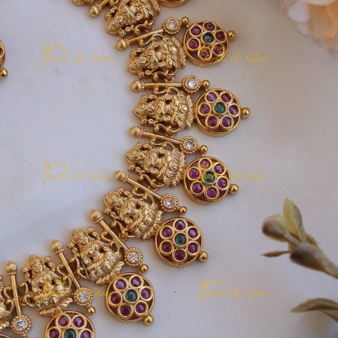 Embrace the essence of tradition and opulence with our Ruby & Emerald Lakshmi Bottu Statement Necklace. This exquisite piece celebrates the divine presence of Goddess Lakshmi, intricately crafted with stunning motifs that evoke a sense of festivity and grandeur.
