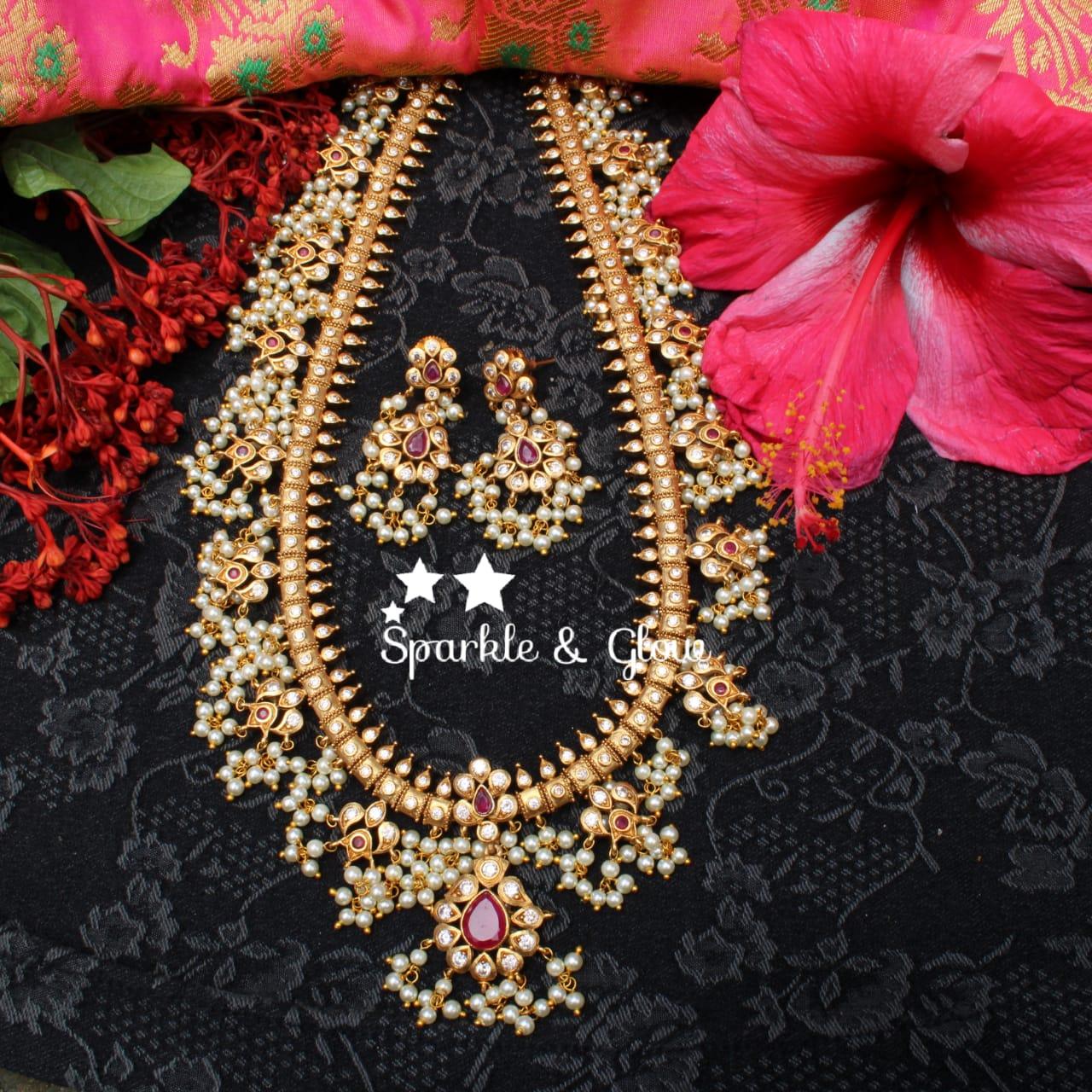 Introducing the Silver Long Gutta Pusalu Matte Necklace, a masterpiece that embodies elegance and festivity. Adorned with intricate motifs and shimmering beads, this necklace is a celebration of traditional craftsmanship. The matte silver finish adds a refined touch, making it an ideal choice for weddings or festive occasions.