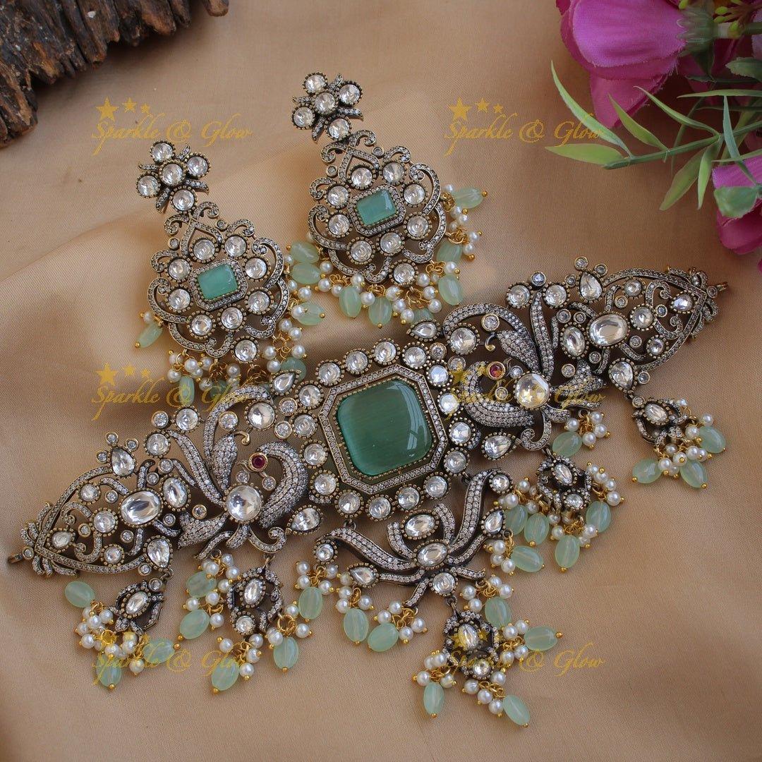 Embrace timeless elegance with our Victorian AD Choker - Peacock Design with Mint Green Beads. This exquisite piece showcases intricate peacock motifs, symbolizing beauty and grace. The choker is adorned with shimmering mint green beads that complement the dazzling AD stones, creating a harmonious blend of colors.