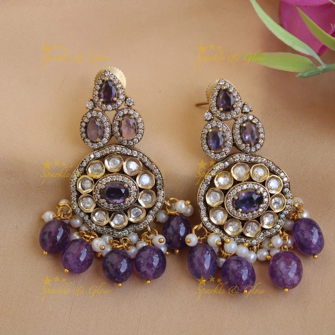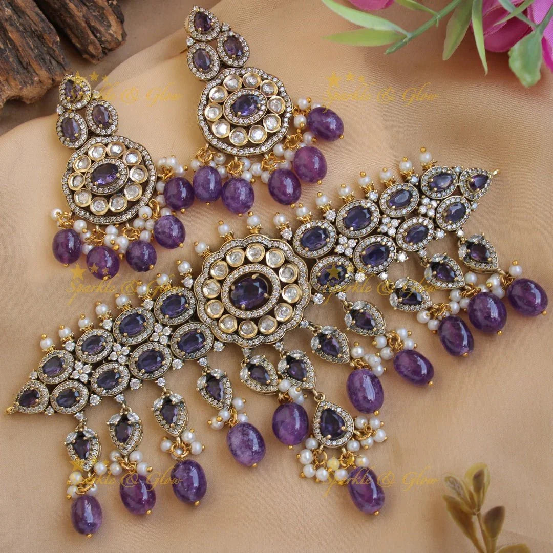 Embrace elegance with our exquisite Victorian AD choker, a masterpiece adorned with intricate floral motifs and resplendent purple beads. This stunning piece combines traditional allure with modern sophistication, perfect for festive occasions. The choker's dazzling stones shimmer with every movement, accentuating the floral design's elegance, while the purple beads add a regal touch.