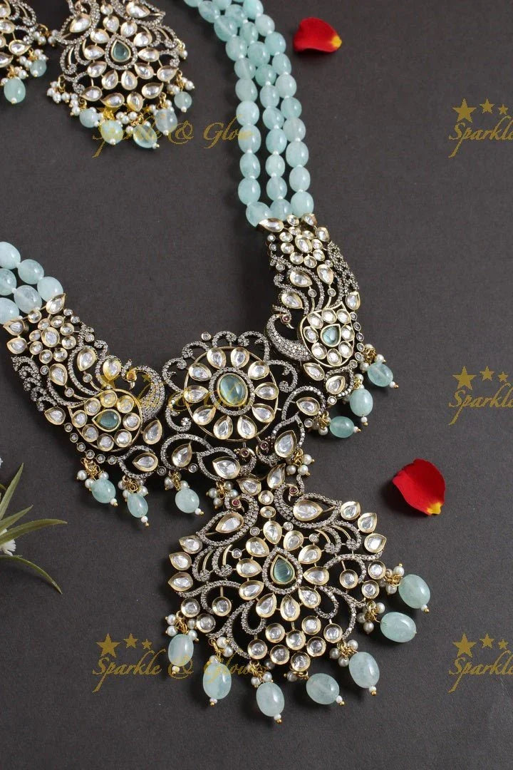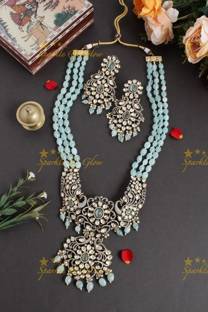 Discover the elegance of the Victorian Silver AD Necklace with Peacock Design, an exclusive masterpiece perfect for festive occasions. This exquisite piece features intricate peacock motifs, symbolizing grace and beauty. The necklace is adorned with shimmering beads in hues of turquoise and silver, creating a harmonious blend of colors that captivate the eye.