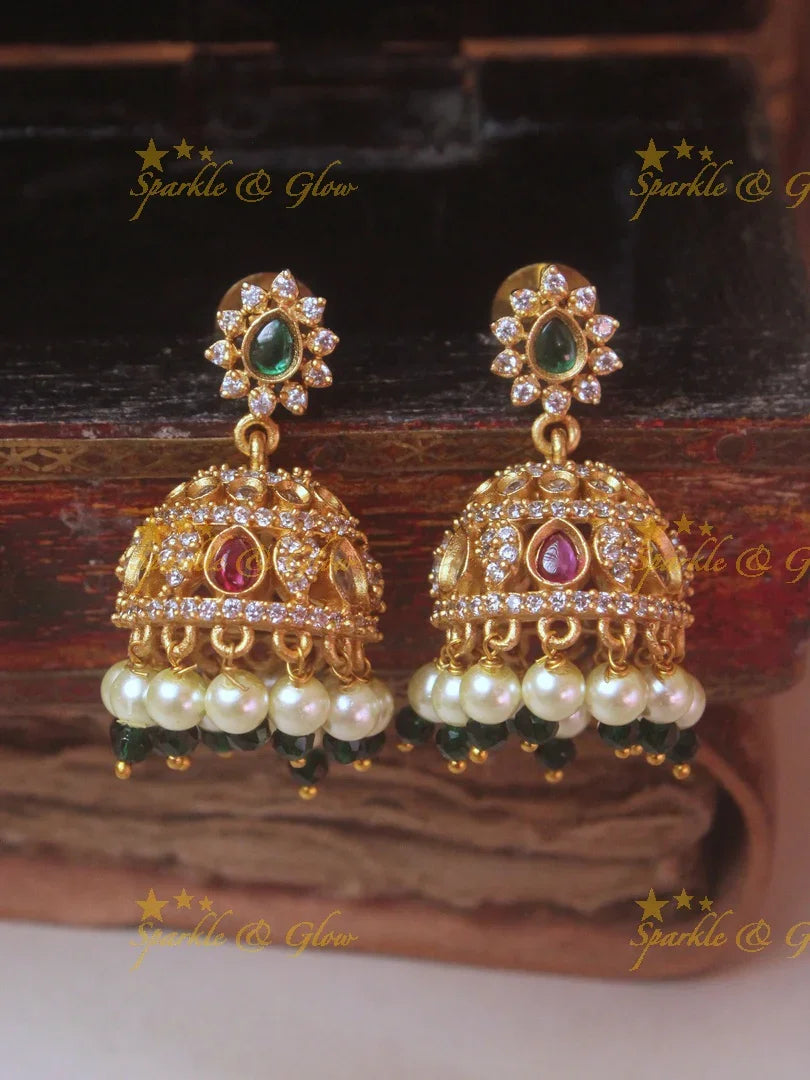 For those who appreciate the intricate artistry of traditional Indian designs, our Premium matte Lakshmi AD coin haram or the Exclusive GJ polish AD necklace with grand jhumukas in pink or green, is a must-have for your collection. Don't forget to explore our delightful range of harams, chokers, jhumkas, and more.