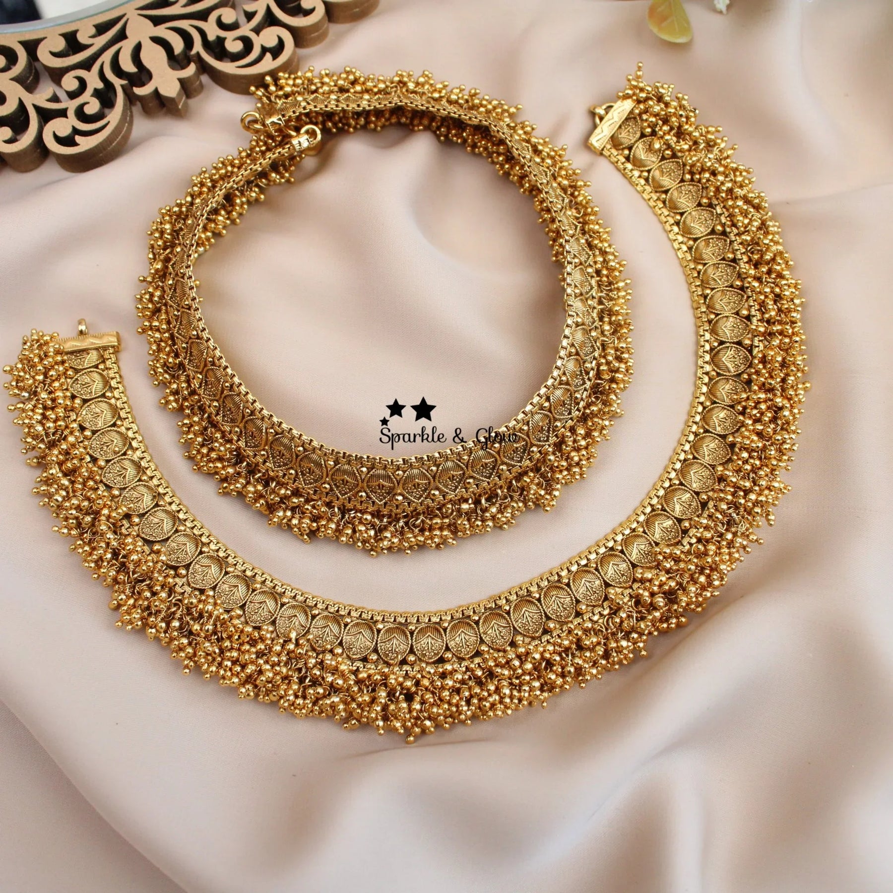 The rich antique gold hue complements any bridal attire, making it a perfect accessory for weddings and festive occasions. The anklets' ornate design showcases fine craftsmanship, with detailed patterns that reflect the beauty of Indian artistry.
