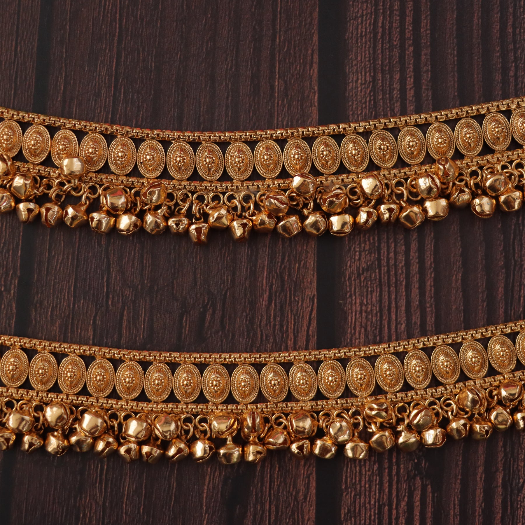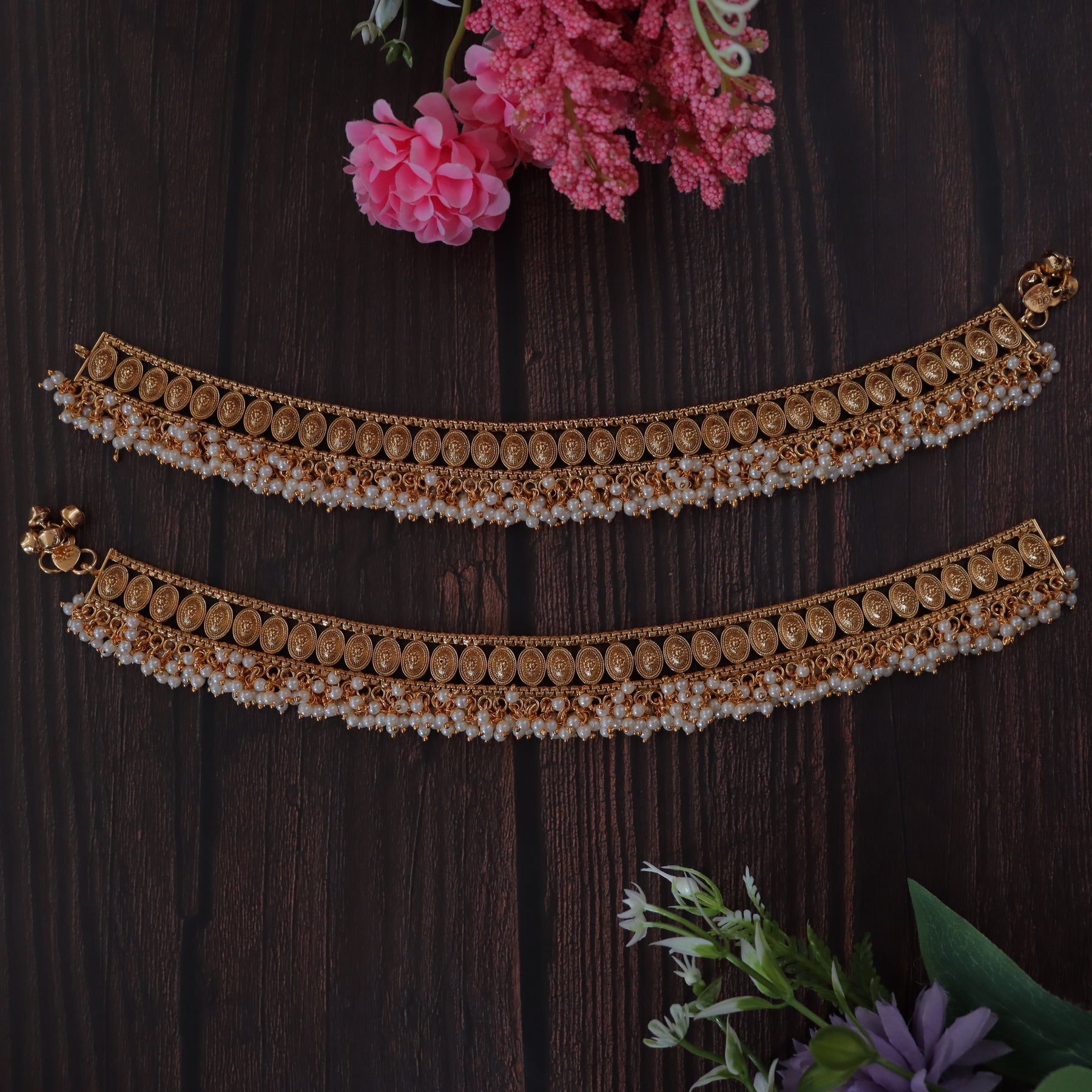 The intricate floral patterns resonate with beauty, while the delicate gold finish adds a touch of opulence. Whether you're a bride looking to add that final touch to your ensemble or someone attending a festive occasion, these anklets are sure to make a statement.