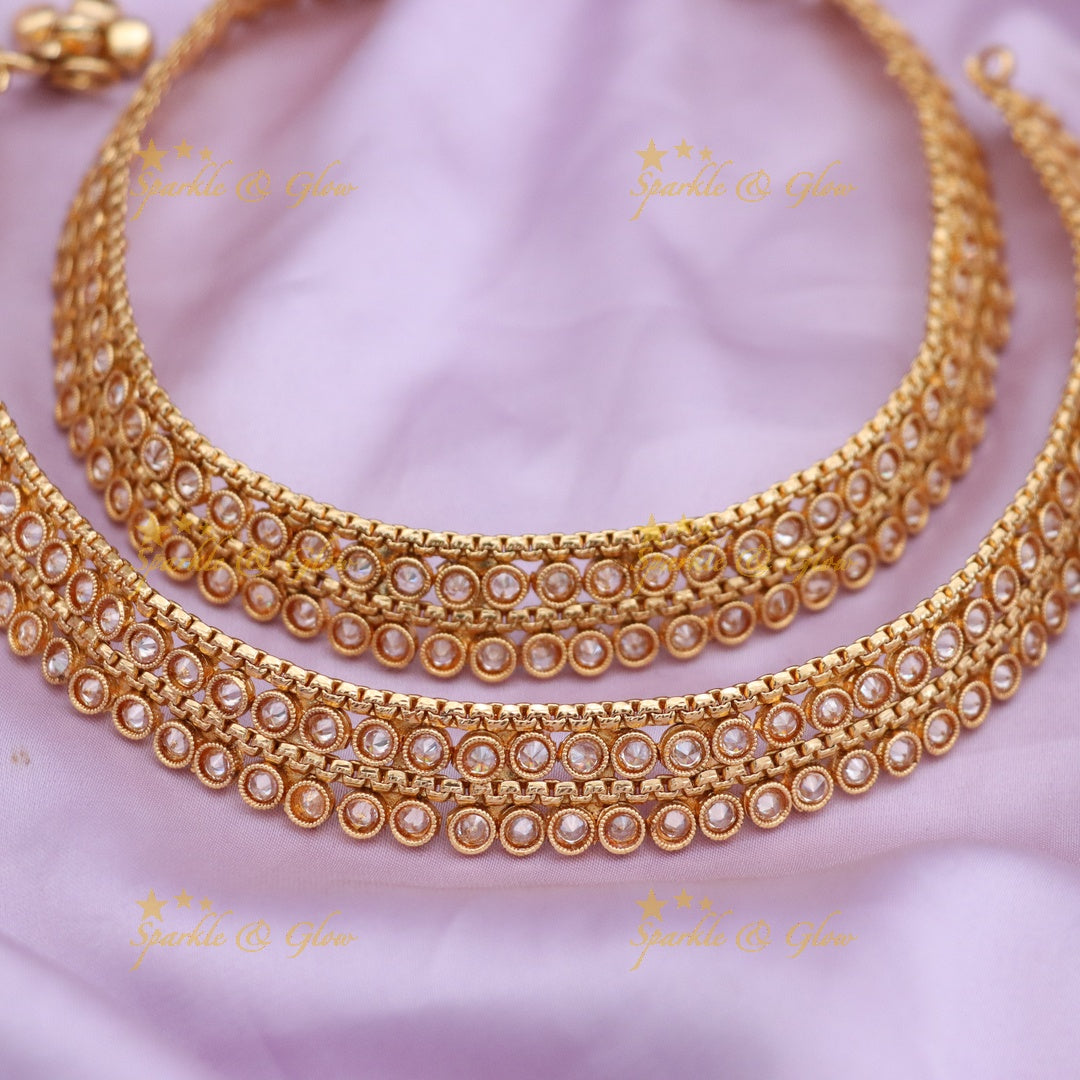 The craftsmanship of our anklets highlights the perfect blend of tradition and contemporary fashion. Designed to exude sophistication, these anklets are a must-have addition to your jewellery collection. Whether you're the bride seeking the perfect complement to your wedding attire or a guest looking to make an impression, these anklets bring timeless beauty and elegance to your look.
