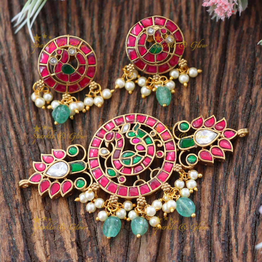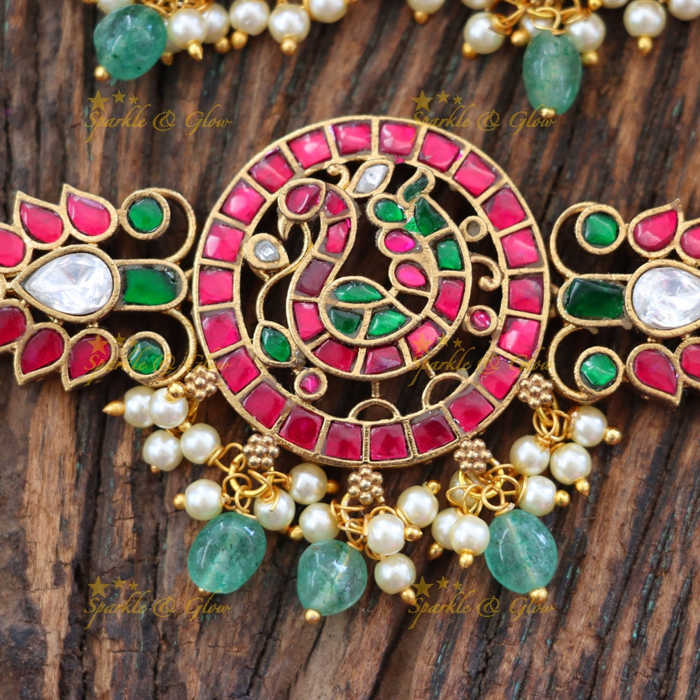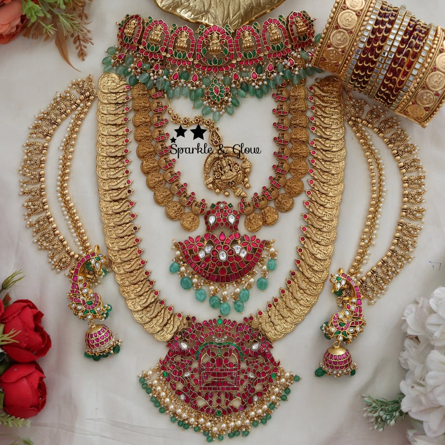 Crafted from high-quality materials, this bridal set emanates resplendence while being lightweight and comfortable for all-day wear. The rich hues of red, green, and gold make it an ideal choice for weddings and festive occasions.