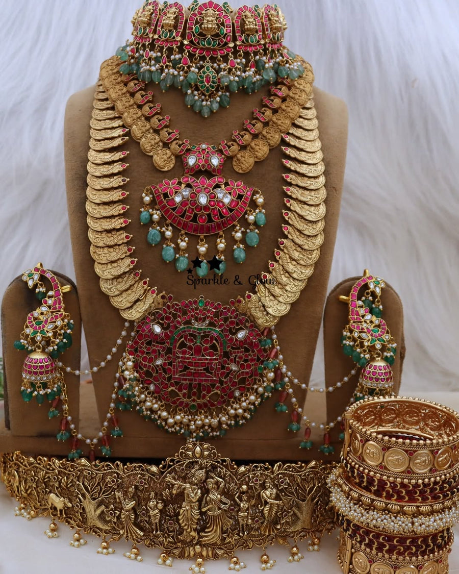 The versatile design ensures it pairs beautifully with a saree or a lehenga, enhancing your bridal look manifold. This set is as perfect for modern brides as it is for traditional ceremonies.