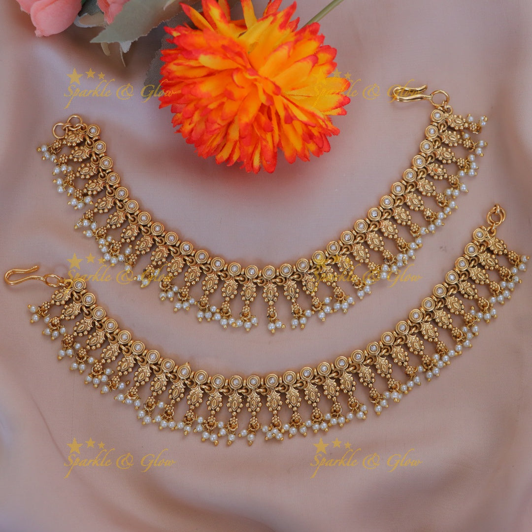 Immerse yourself in the opulence of tradition with our Kundan-Inspired Gold Bridal Haram Set. This exquisite piece showcases a harmonious blend of intricate motifs and lustrous kundan stones, capturing the essence of Indian heritage. The rich gold finish paired with delicate floral designs and sparkling beads adds a regal touch to your bridal ensemble.