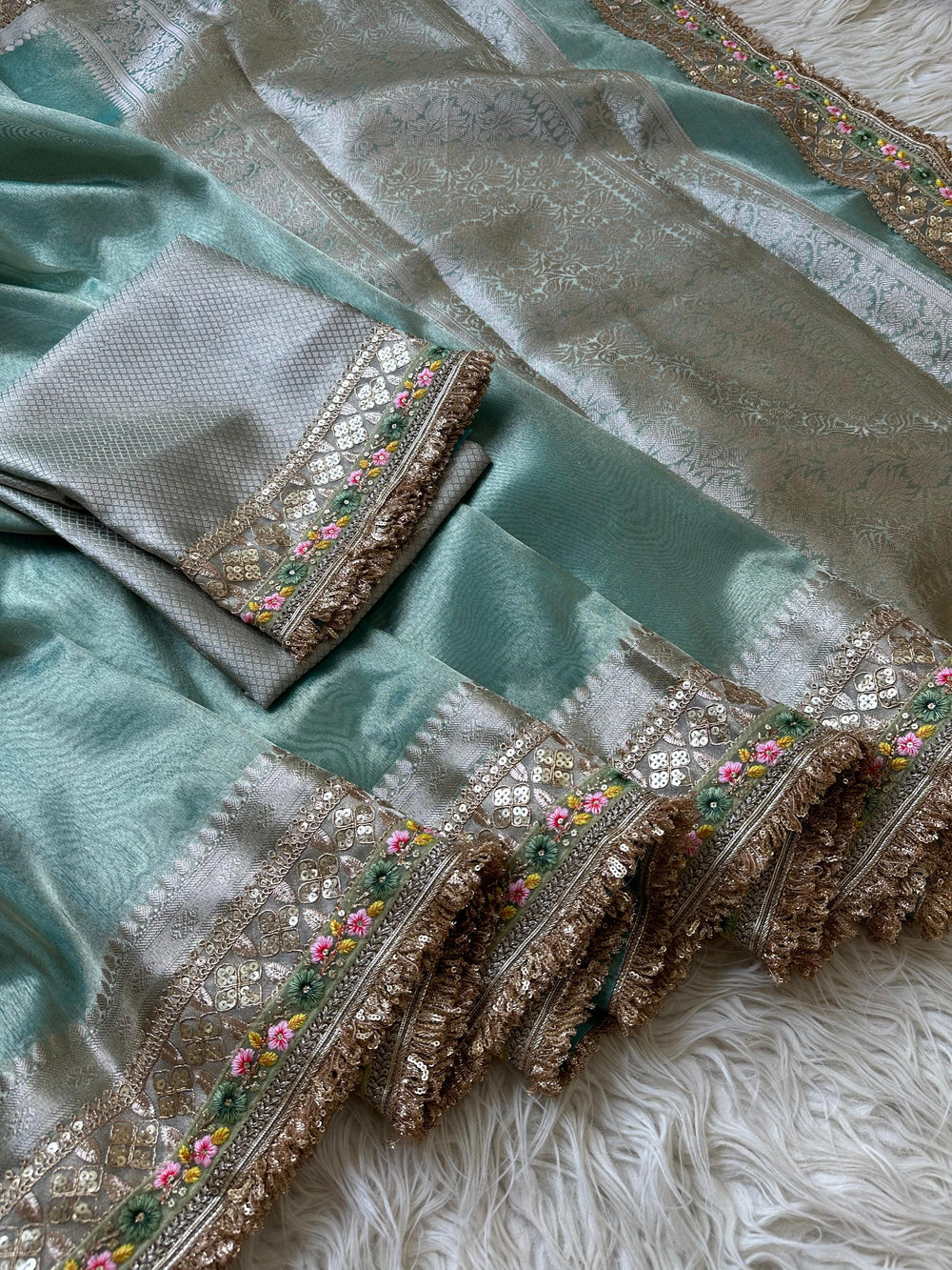 - Pallu: Opulent zari pallu featuring intricate patterns and a grand finish