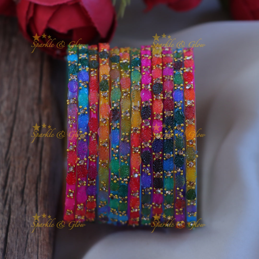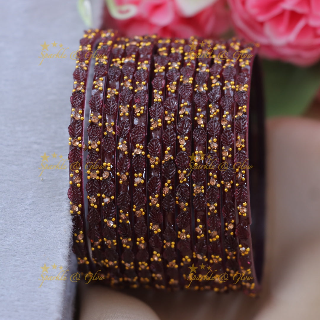 The bangle's captivating design features delicate leaf motifs set against a vibrant green backdrop, symbolizing growth and prosperity. Crafted from premium quality metal, the bangle ensures durability and shine, making it an excellent choice for multiple occasions.