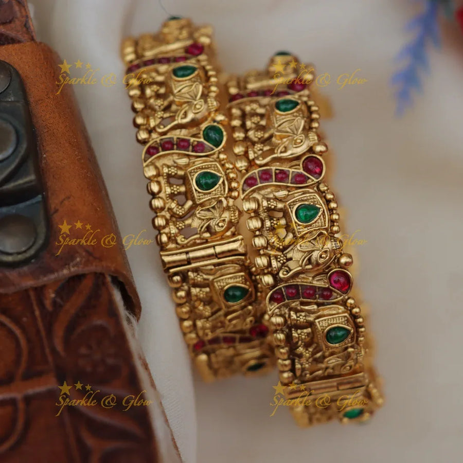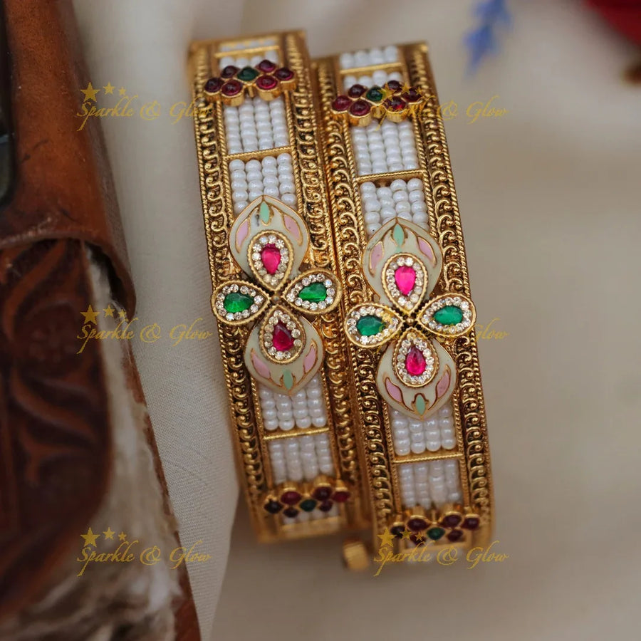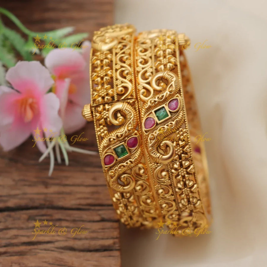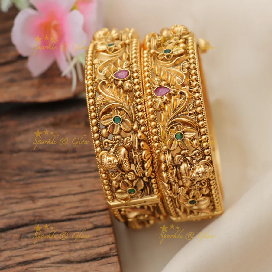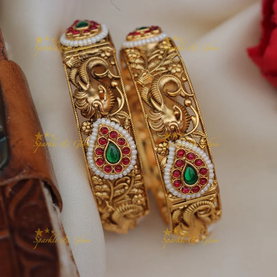 Our exquisite collection of bangles is a testament to the timeless elegance of Indian craftsmanship. Ranging from matte gold Peacock and Lakshmi carved bangles, to delicately designed AD flower stone bangles, our collection embraces a rich diversity of designs and finishes. A standout piece is the Matte polish pearl bangles, a true embodiment of traditional charm and modern sophistication.
