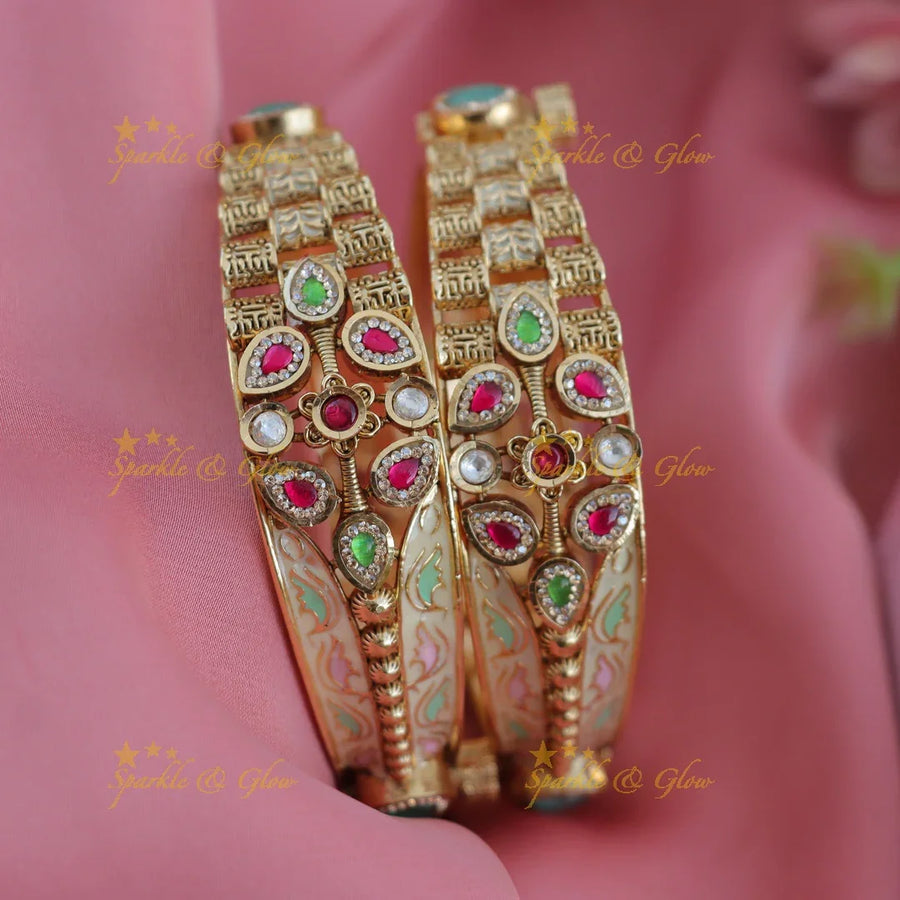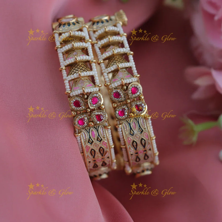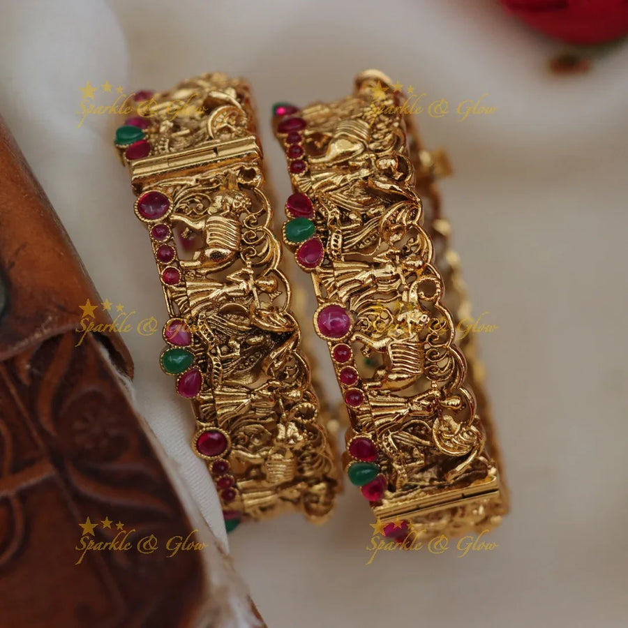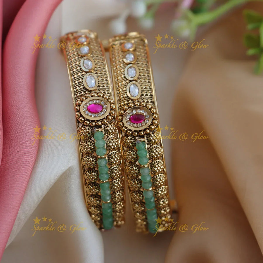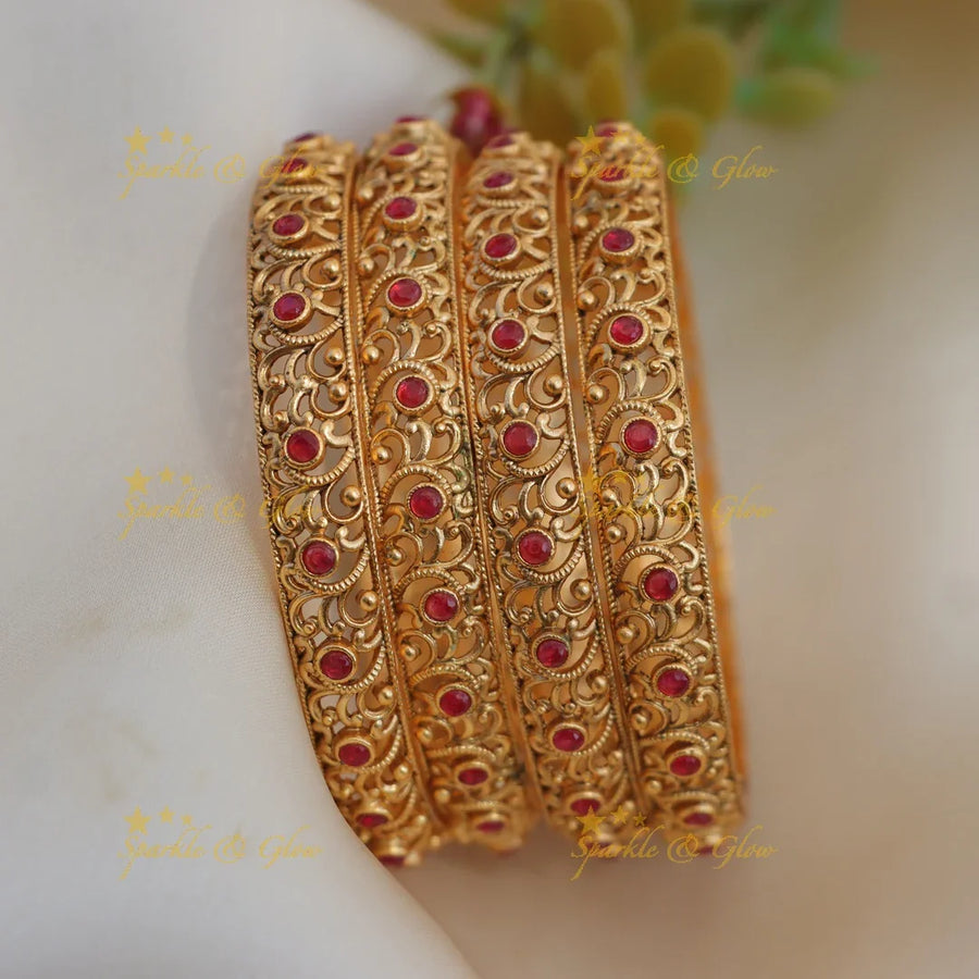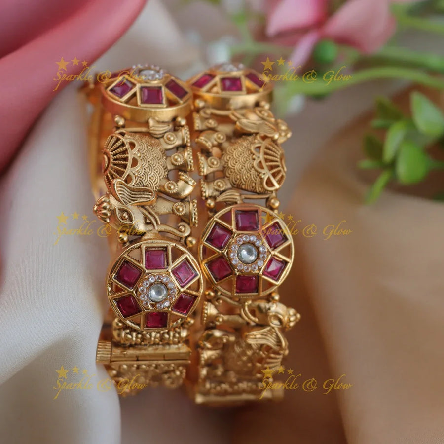 Our exquisite collection of bangles is a testament to the timeless elegance of Indian craftsmanship. Ranging from matte gold Peacock and Lakshmi carved bangles, to delicately designed AD flower stone bangles, our collection embraces a rich diversity of designs and finishes. A standout piece is the Matte polish pearl bangles, a true embodiment of traditional charm and modern sophistication.