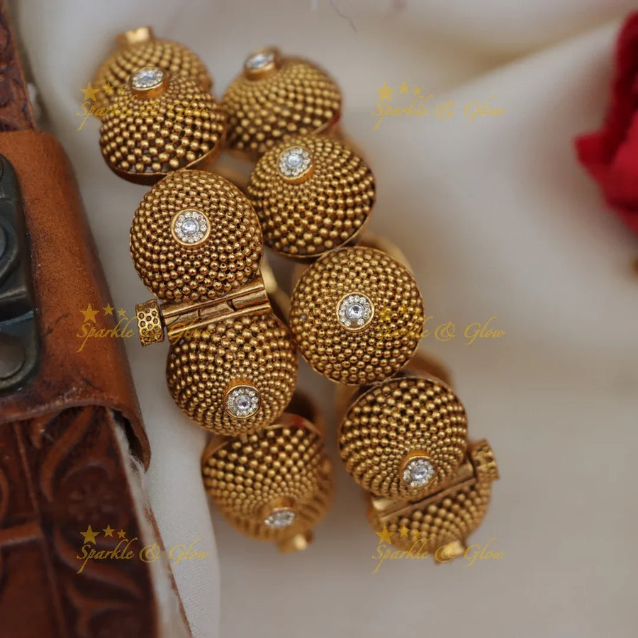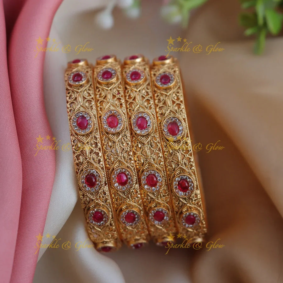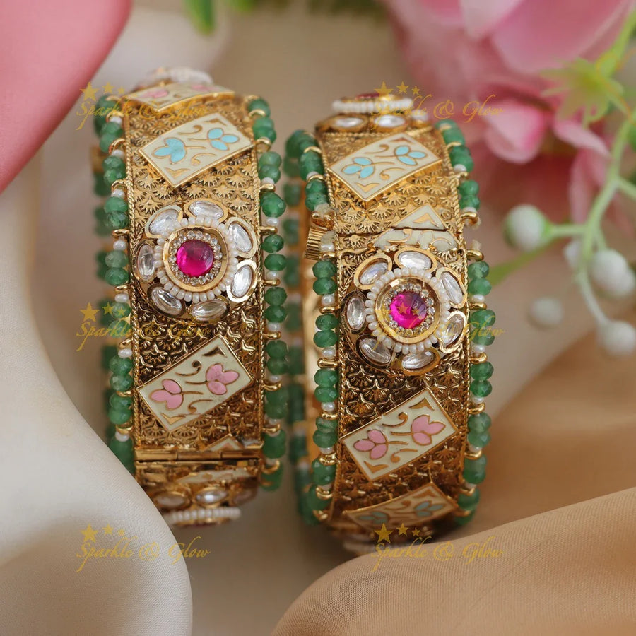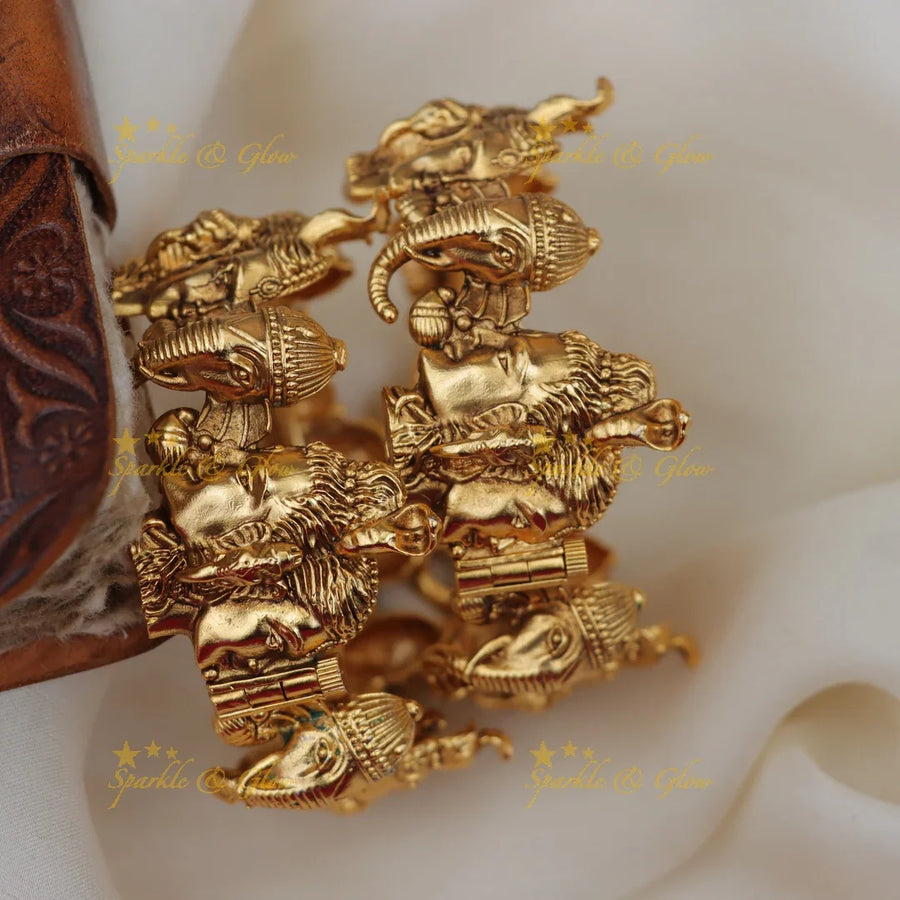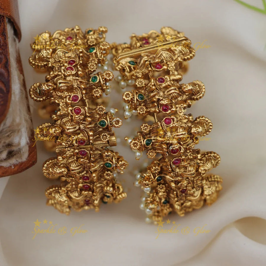 Our exquisite collection of bangles is a testament to the timeless elegance of Indian craftsmanship. Ranging from matte gold Peacock and Lakshmi carved bangles, to delicately designed AD flower stone bangles, our collection embraces a rich diversity of designs and finishes. A standout piece is the Matte polish pearl bangles, a true embodiment of traditional charm and modern sophistication.