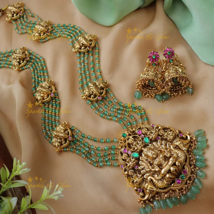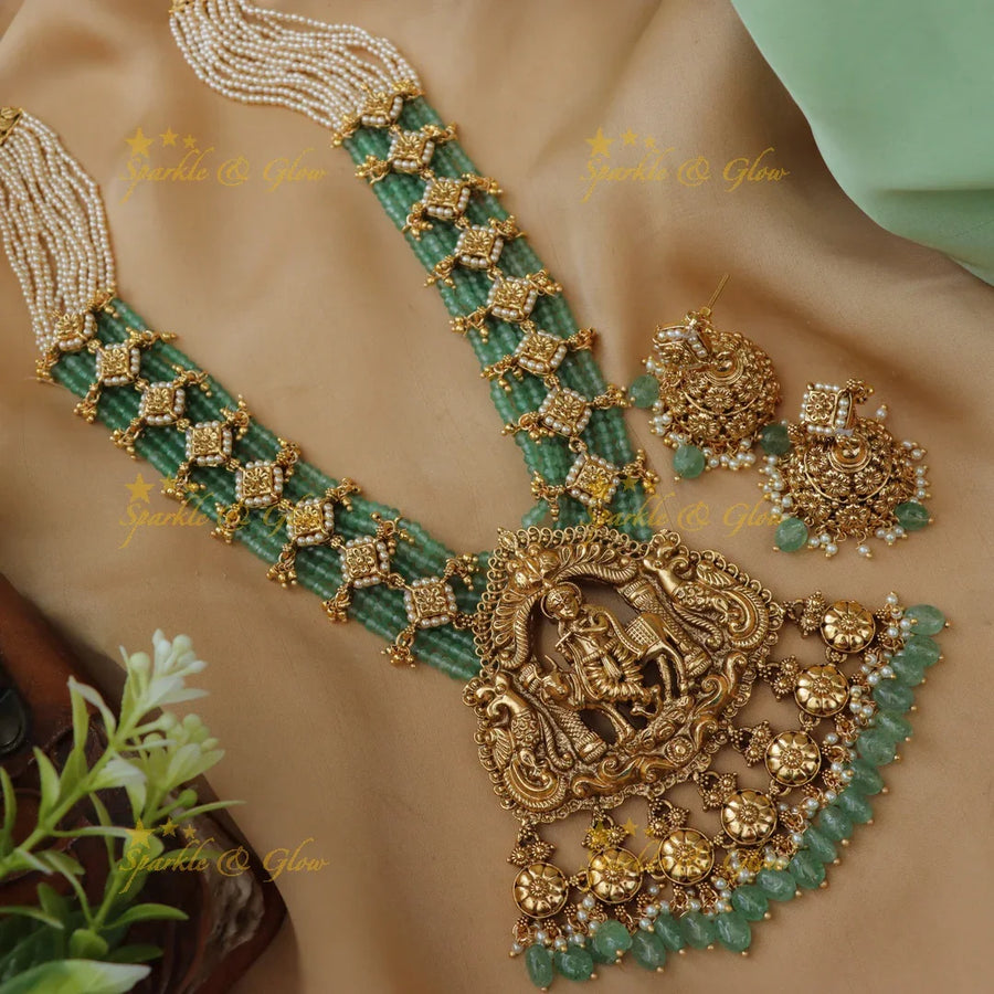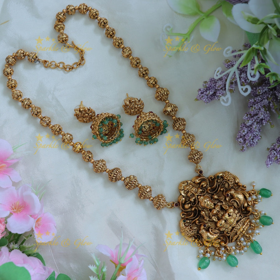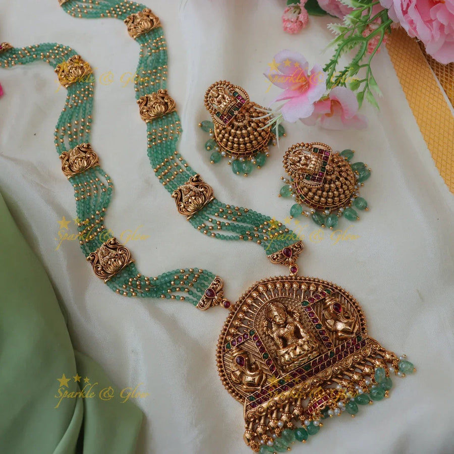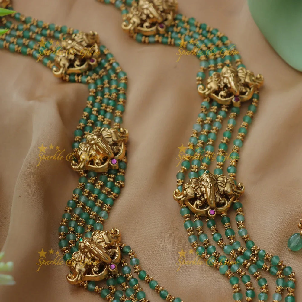 Our Beaded Necklaces Collection showcases a stunning range of jewellery pieces, each one more exquisite than the last. From glistening gutta pusalu harams adorned with sparkling kemp and cz stones, to high neck chokers featuring real kemp stones and vibrant green beads, our collection offers variety and quality. Each necklace is meticulously crafted, with a matte gold polish finish that reflects the richness of traditional Indian jewellery.
