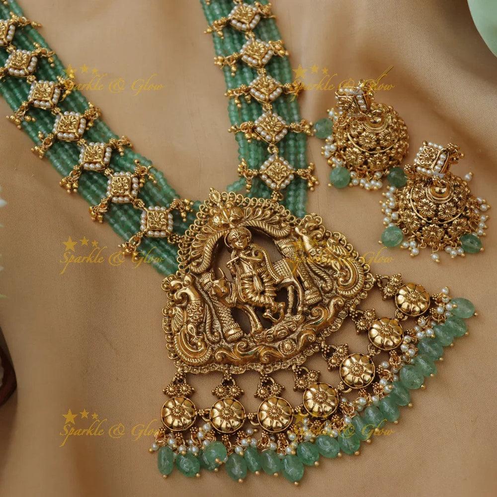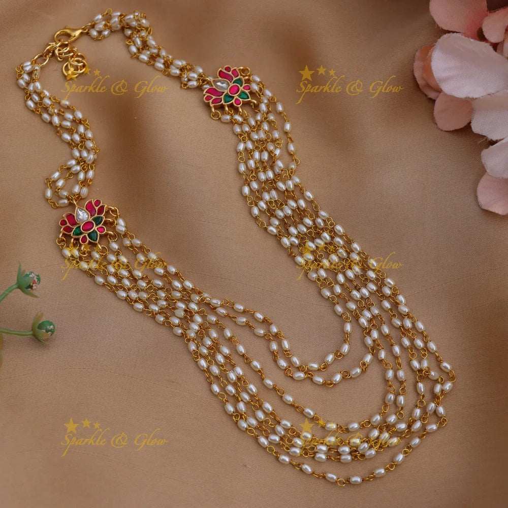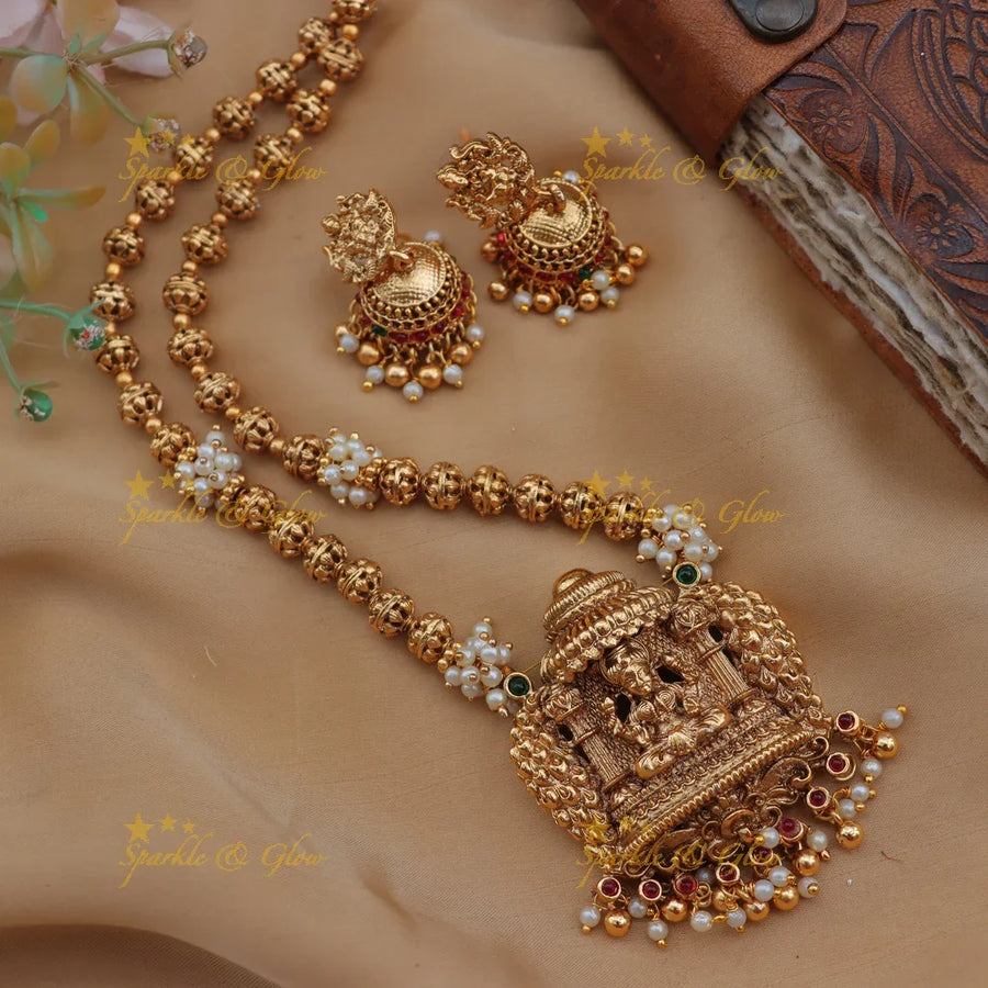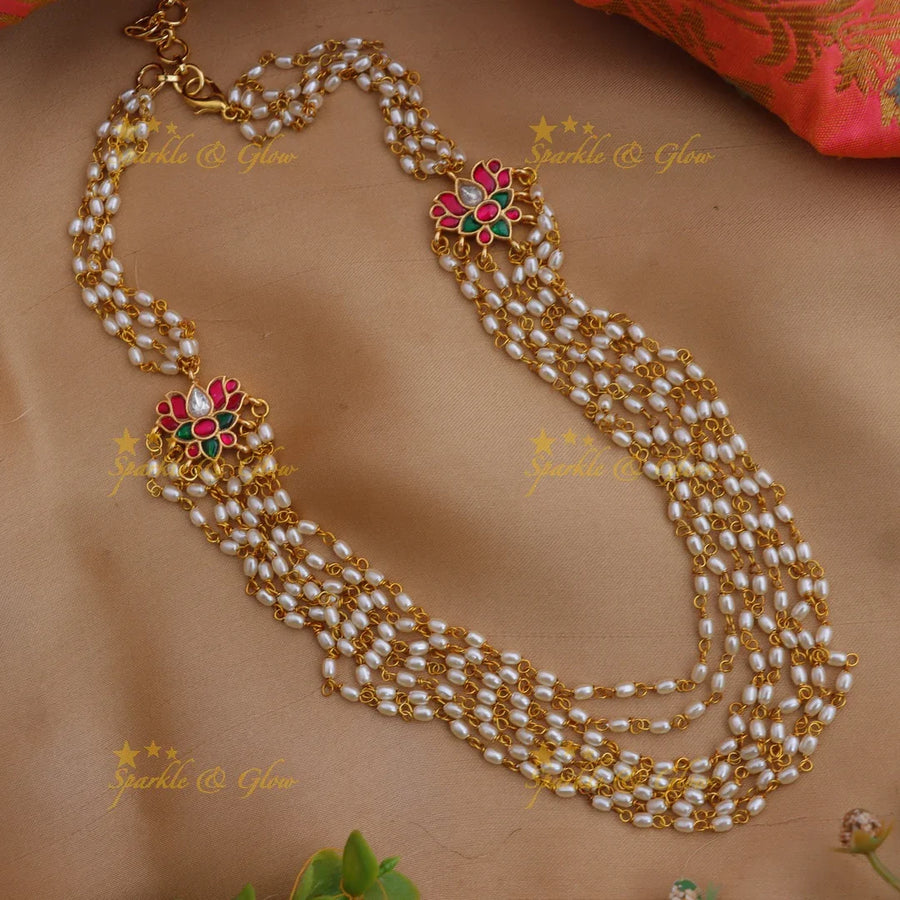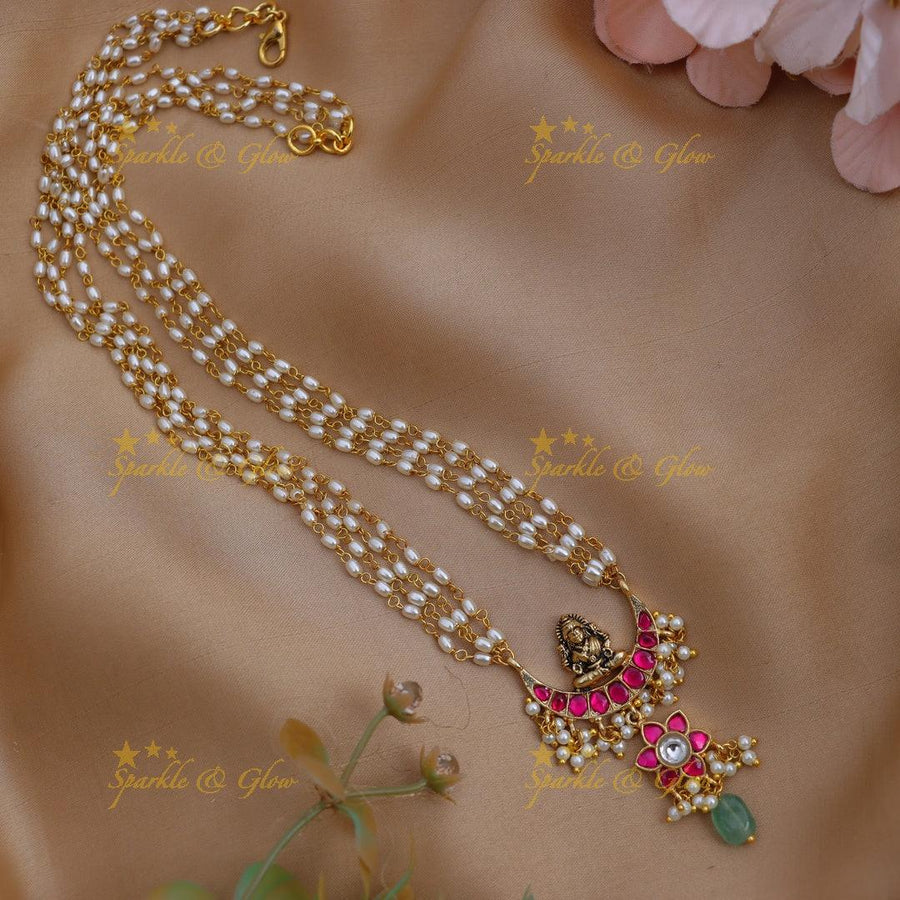 Our Beaded Necklaces Collection showcases a stunning range of jewellery pieces, each one more exquisite than the last. From glistening gutta pusalu harams adorned with sparkling kemp and cz stones, to high neck chokers featuring real kemp stones and vibrant green beads, our collection offers variety and quality. Each necklace is meticulously crafted, with a matte gold polish finish that reflects the richness of traditional Indian jewellery.