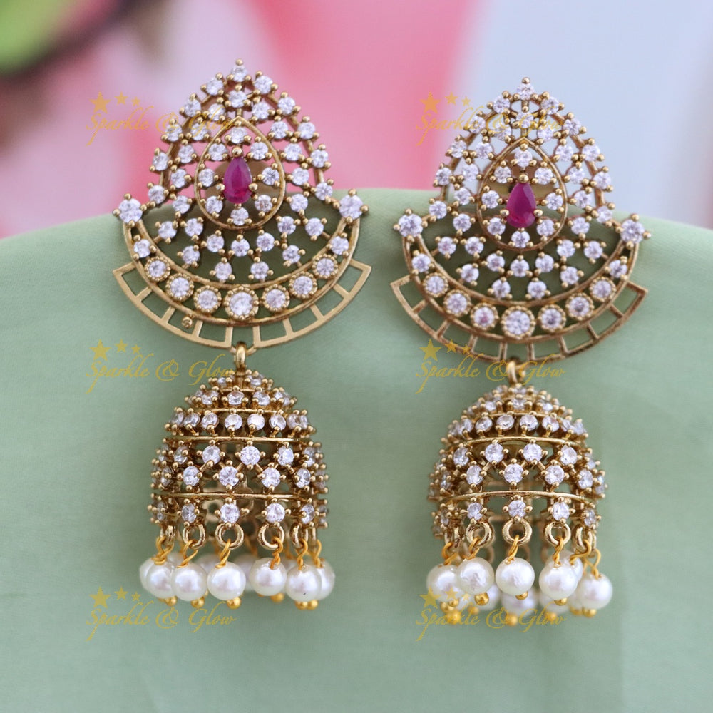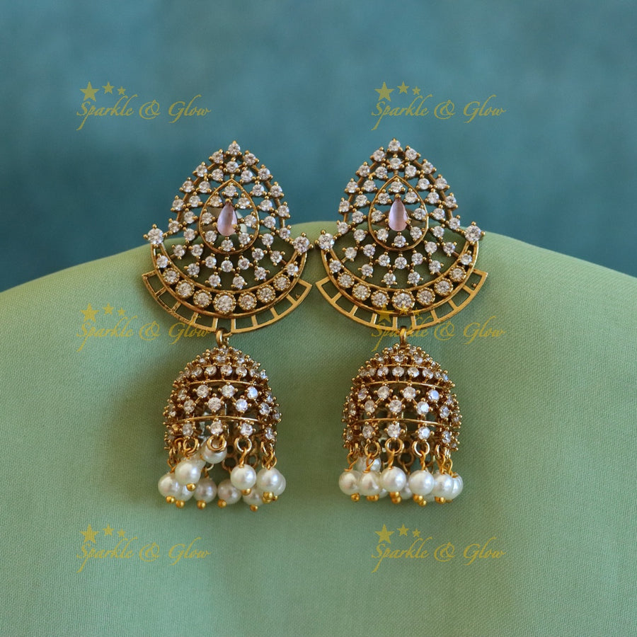 Gold Jhumka Earrings with Leaf AD Stone Earrings Set