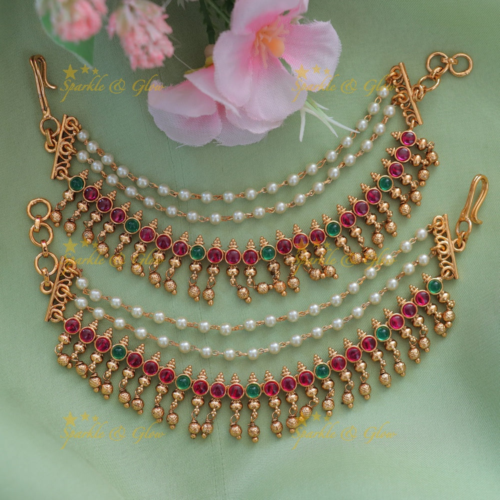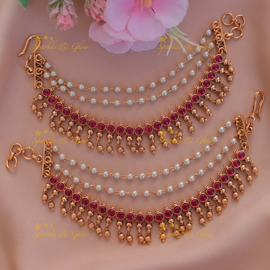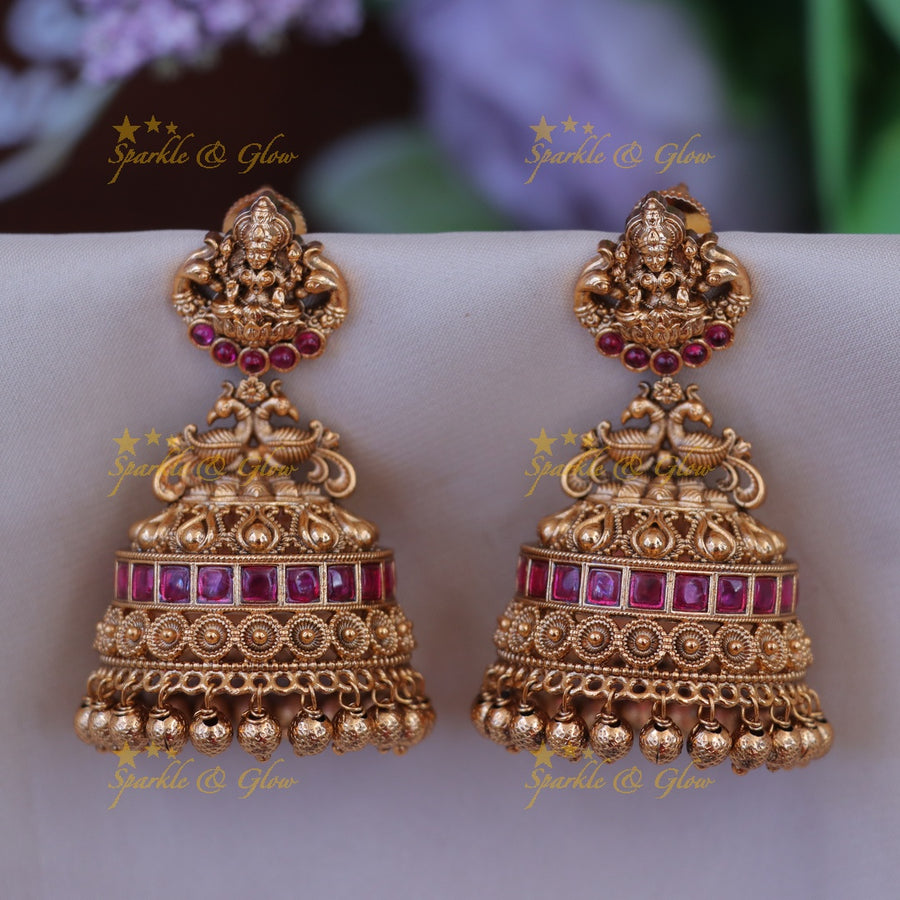 Featuring the revered Lakshmi motif, a symbol of wealth and prosperity, these earrings reflect rich cultural heritage and artistry. The earchain adds a graceful touch, making it perfect for weddings, festivals, and grand celebrations. Adorned with vibrant kemp stones, their brilliance captures the essence of royal elegance.