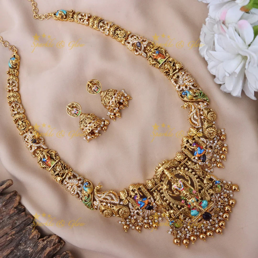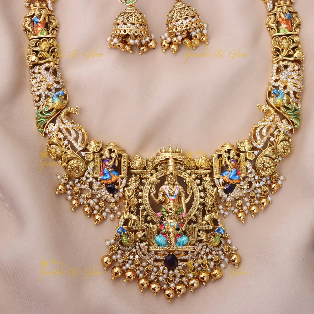 Temple Bridal Jewellery Set with Long Necklace, Maang Tikka, Earchain & Bangle