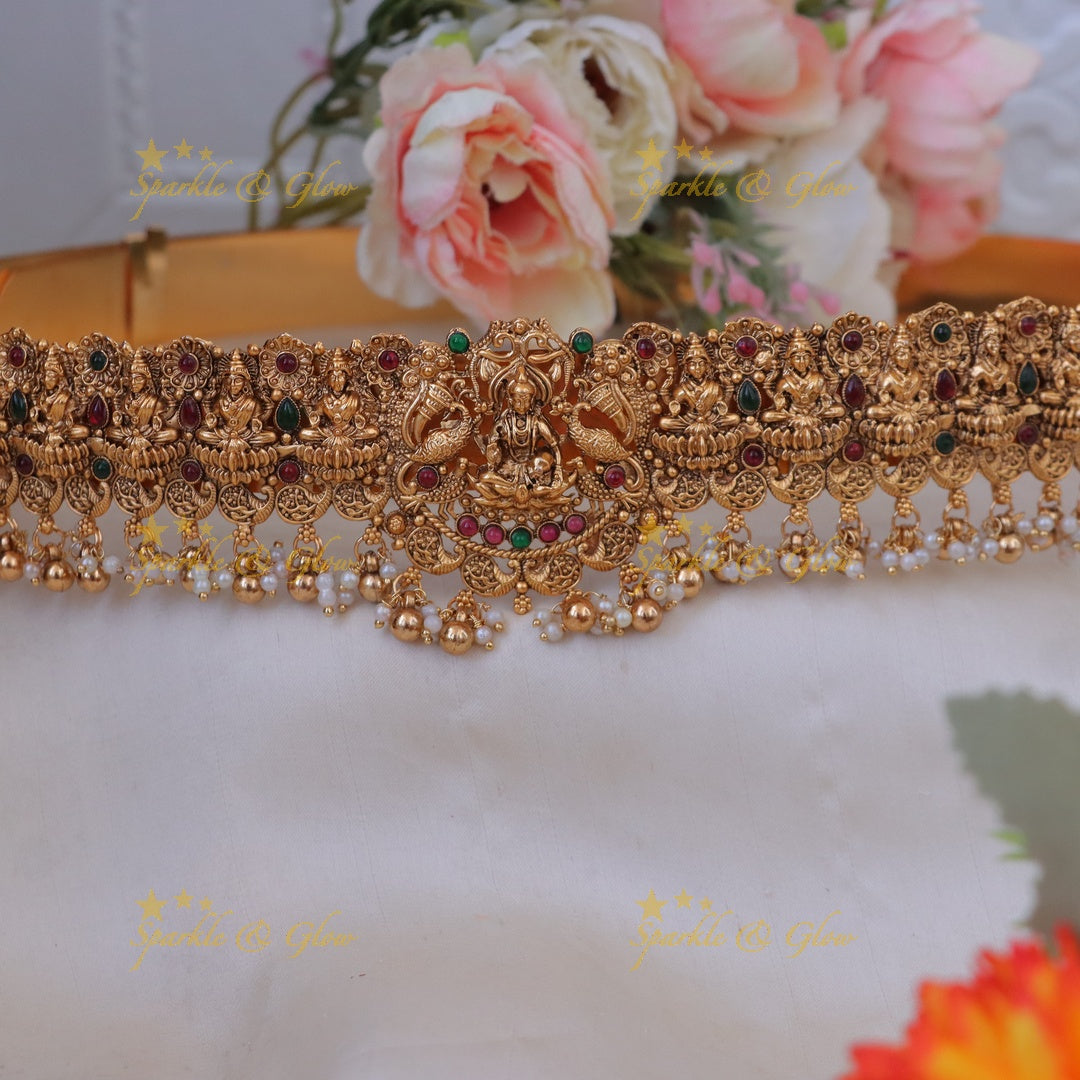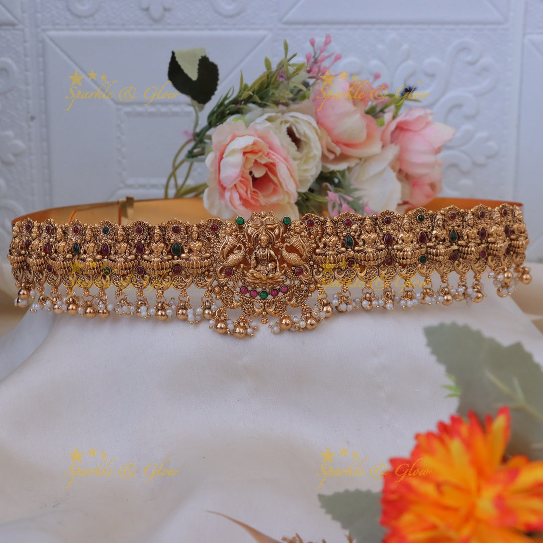 Featuring an elegant fusion of mango motifs, Lakshmi figurines, and majestic peacocks, this hip belt is a testament to artisanal craftsmanship. Each element is meticulously adorned with vibrant stones, resonating with the grandeur of timeless traditions. The captivating gold finish ensures that you will dazzle at any occasion, be it a grand wedding or a festive celebration.