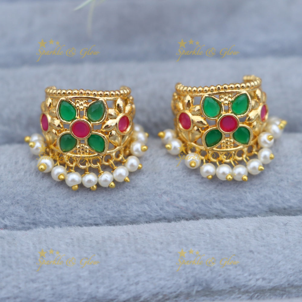 If you are seeking the authentic Maharashtrian effect but don't have a helix, simply wear a jhumka or stud below it; they will pair nicely and make the stacked look. The overall look is really beautiful, suitable for a festive occasion, and easy to wear.