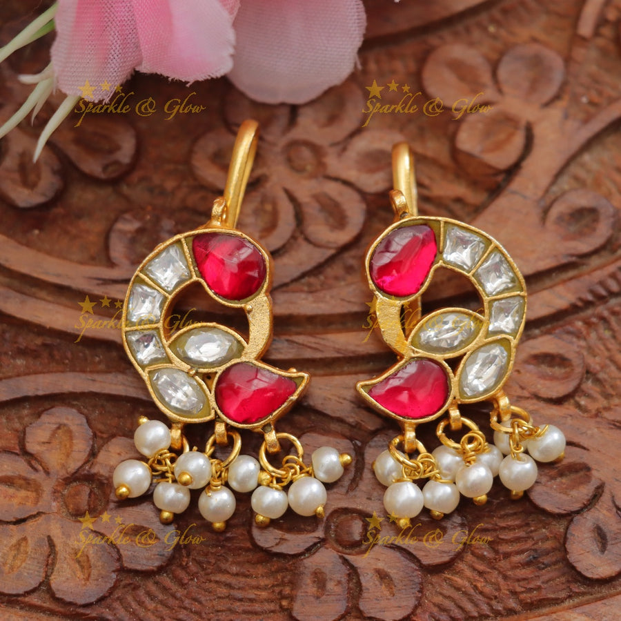 Discover the timeless elegance of our Exquisite Jadau Peacock Bugadi Earrings, perfect for elevating your festive and wedding ensembles. Combining the rich tradition of jadau craftsmanship with a contemporary twist, these earrings are a must-have in your jewellery collection. Crafted with precision, these bugadi earrings showcase intricate peacock motifs, a symbol of grace and beauty, making them an ideal choice for festive occasions. The blend of vibrant red and sparkling white stones, set against a gold backdrop, captures the eye and adds a touch of royal elegance to any outfit.