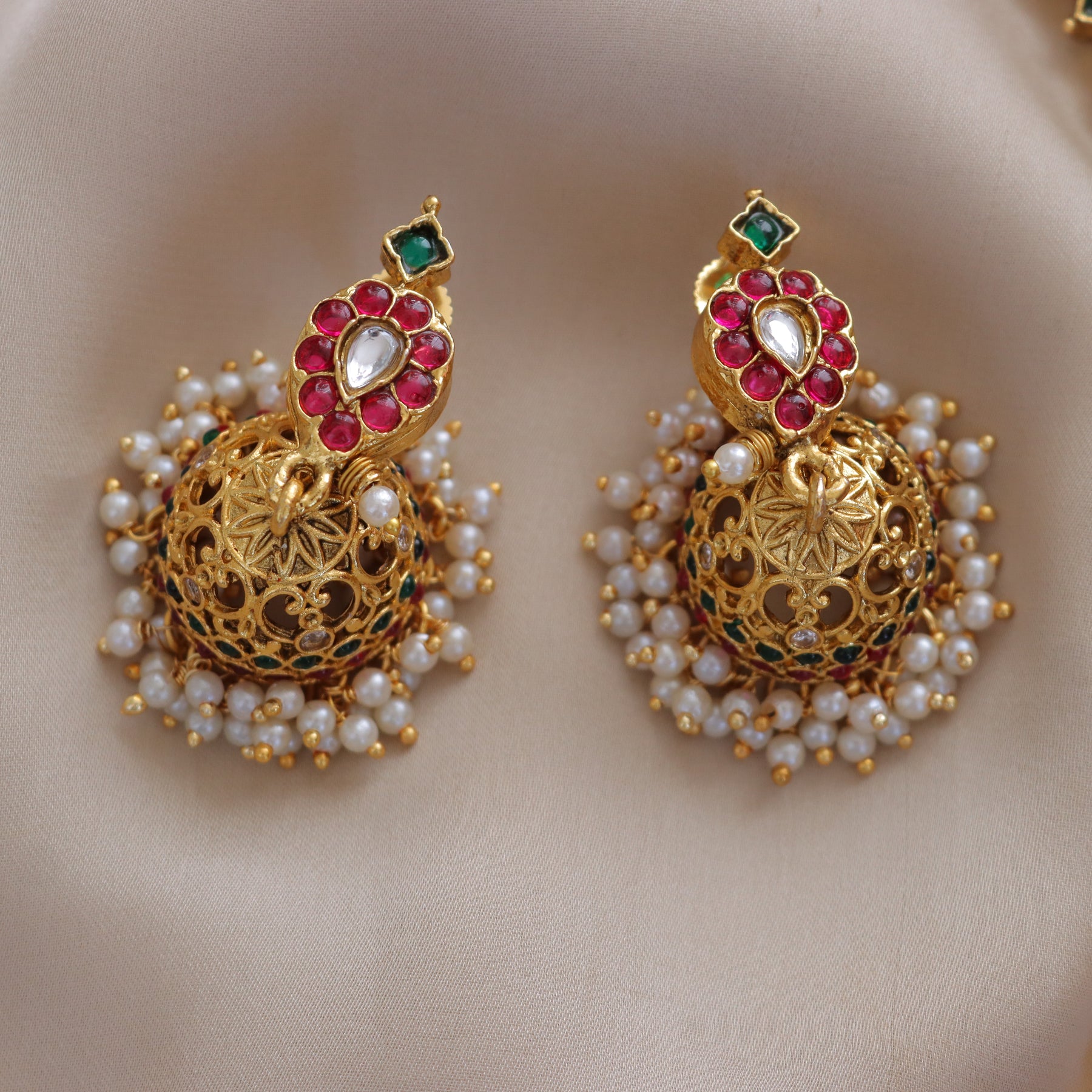 Inspired by the rich cultural heritage of South India, this necklace is meticulously crafted with a blend of red and green stones, symbolizing prosperity and harmony. The mango design, an embodiment of grace, seamlessly combines with floral motifs, creating a mesmerizing effect.