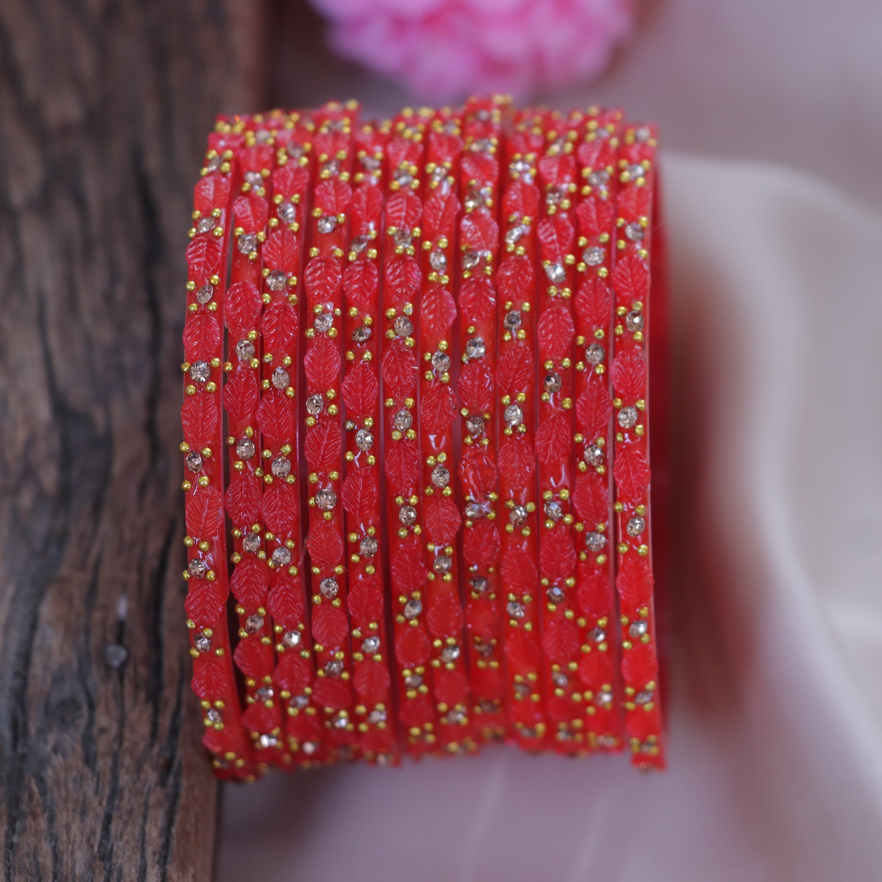 Embrace elegance with our Vintage Leaf-Patterned Stone Glass Bangles Set, a perfect addition for festive celebrations and weddings. Each bangle is a masterpiece with intricate leaf motifs, adorned with shimmering stones that reflect a golden glow. The vibrant palette includes hues of royal purple, emerald green, and ruby red, ensuring they complement any outfit with grace and style.