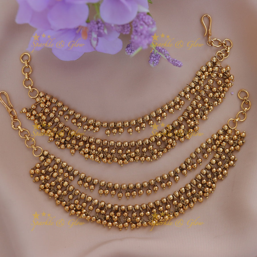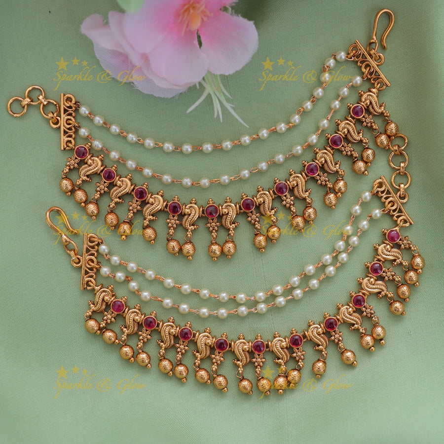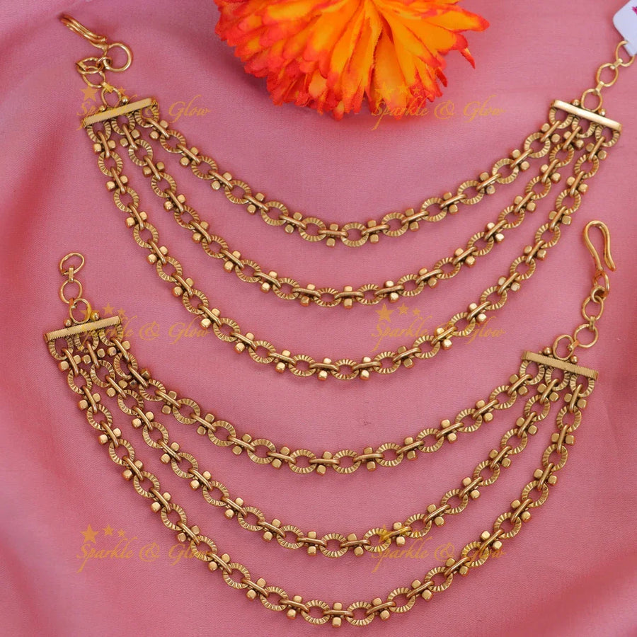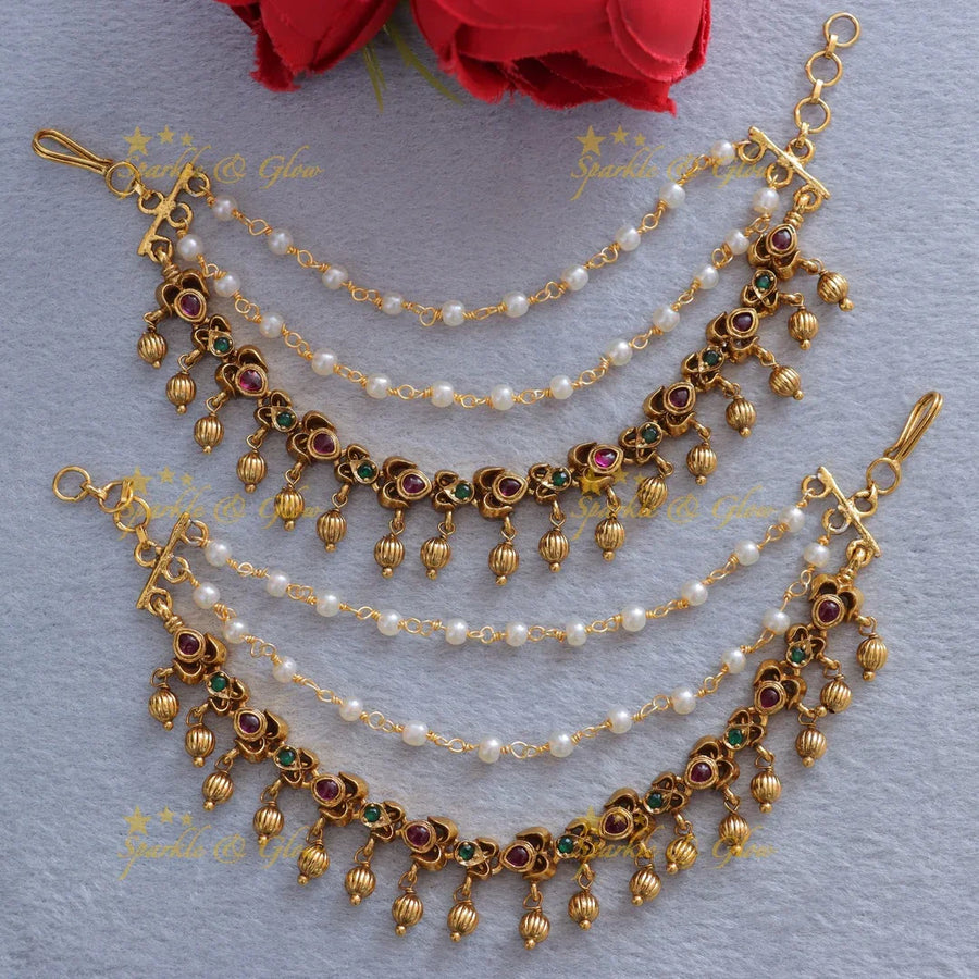 The highlight of this ear chain design is its antique matte gold finish that mimics the luster of traditional temple jewellery. Embellished with tiny mango motifs, floral elements, and bead hangings, the chains exude richness without overwhelming the rest of your look. Running along the edge of the ear and attaching delicately to your hair or behind the ear, they secure gracefully with hooks to offer both comfort and stability during extended wear.