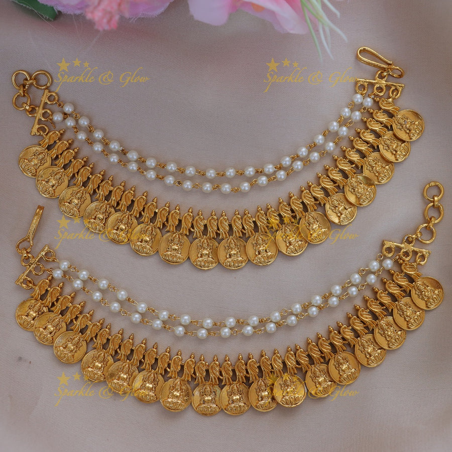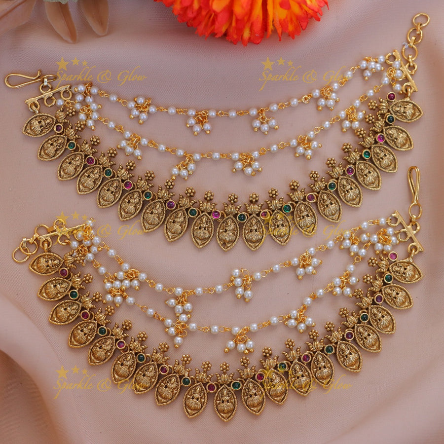 Accentuate your traditional charm with these Elegant Gold Finish Ear Chains – a timeless accessory that brings together heritage, grace, and intricate craftsmanship. Designed for those who adore the ethereal beauty of South Indian bridal and festive ensembles, this pair of ear chains radiates royalty and devotion with every gleam. Whether styled with jhumkas or studs, this piece adds a temple jewellery flair that beautifully frames the ear and enhances any hairstyle.