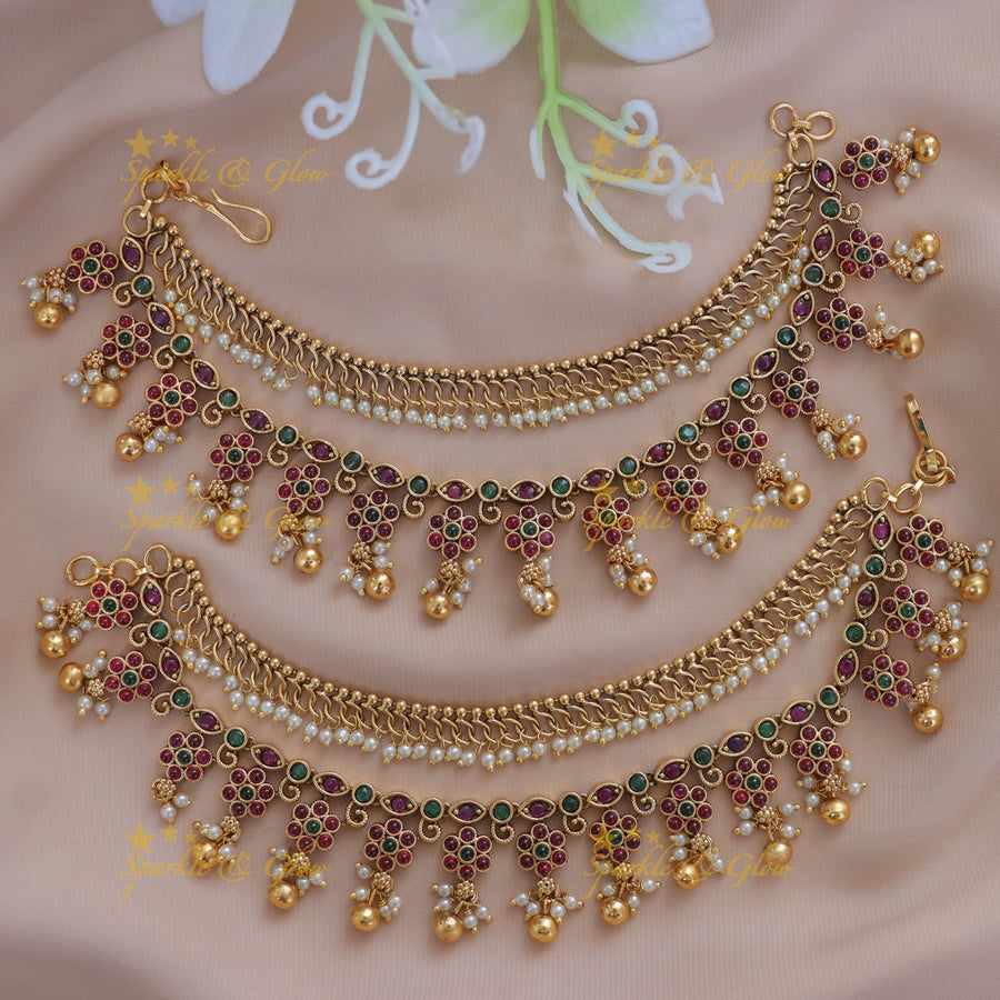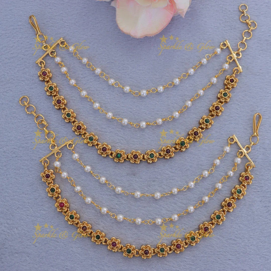 Each link of the chain is finished with a smooth, polished texture that glides gently along your tresses. Tiny ruby red and emerald green stones interspersed across the motifs bring in vibrant bursts of colour, reminiscent of vintage South Indian craftsmanship. Perfect for complementing traditional sarees or lehengas, this ear chain pairs effortlessly with Jadau or Kemp jewellery sets.