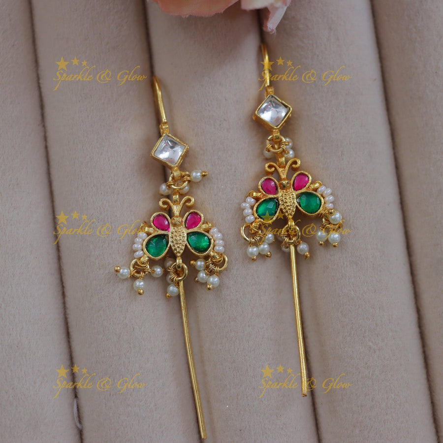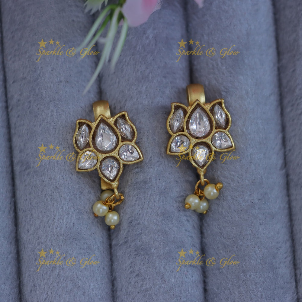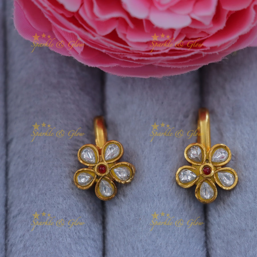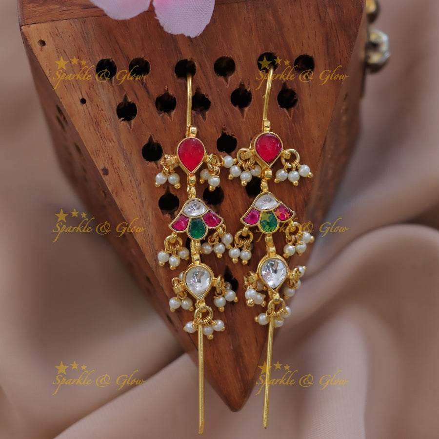 Perfect for festive occasions and celebrations, these earrings are crafted with semi-precious stones, pearls, kemp flowers, and other elegant detailing. The gold finish and geru gold polish lend a touch of sophistication, making these earrings a must-have addition to your jewellery collection.