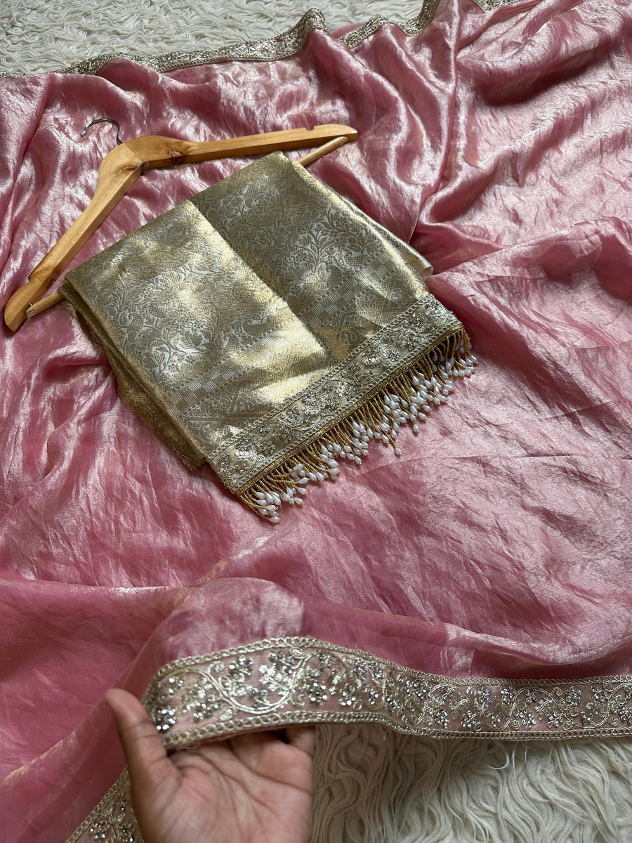 Discover elegance and opulence with our Premium Gold Zari Tissue Silk Saree. This exquisite ensemble is crafted to perfection, showcasing the rich heritage of Indian textiles. The luxurious fabric combines delicate tissue silk with lustrous gold zari, creating an ethereal shimmer for a timeless look.