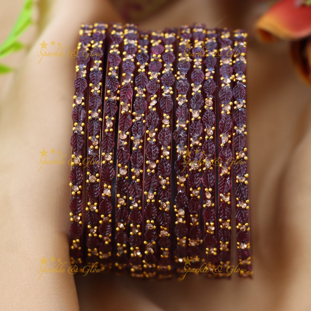 Embrace elegance with our Vintage Leaf-Patterned Stone Glass Bangles Set, a perfect addition for festive celebrations and weddings. Each bangle is a masterpiece with intricate leaf motifs, adorned with shimmering stones that reflect a golden glow. The vibrant palette includes hues of royal purple, emerald green, and ruby red, ensuring they complement any outfit with grace and style.