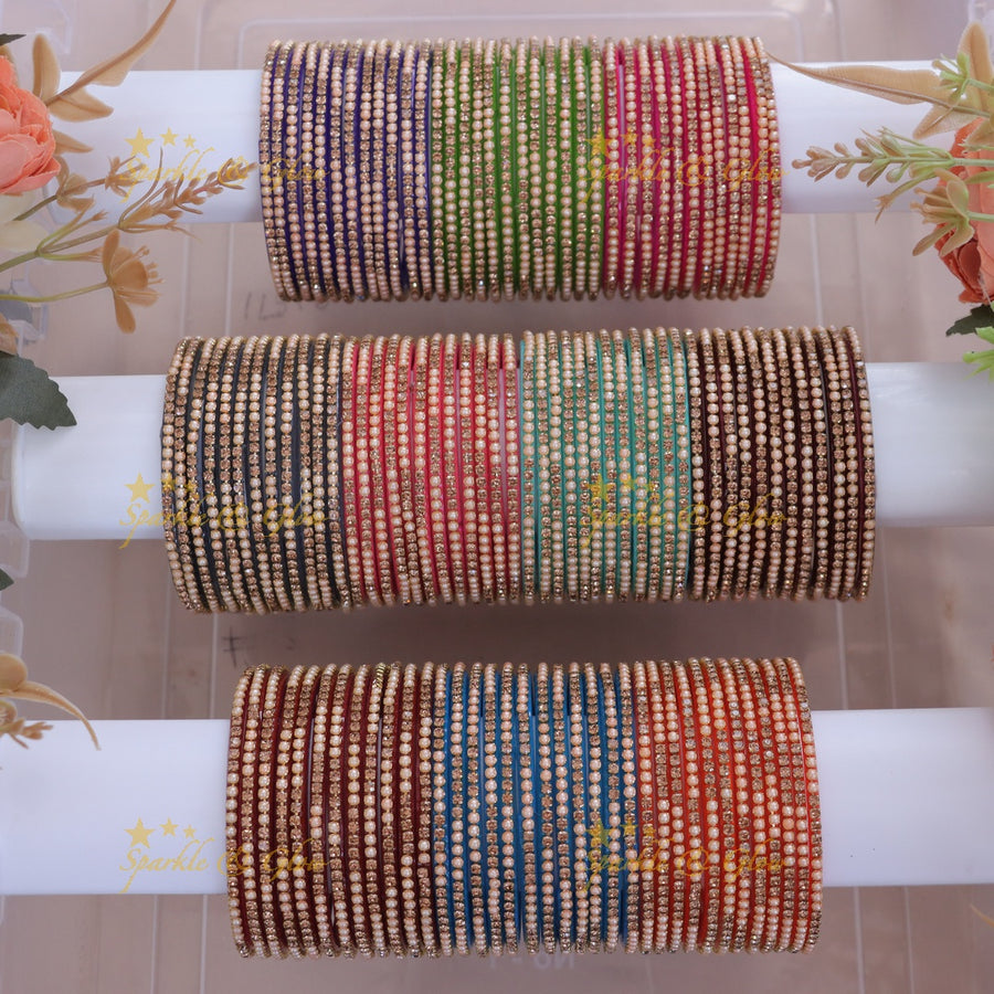 Bask in the radiance of our stunning Glass Bangles Collection, an exquisite assemblage of Indian imitation jewellery. Each piece in this collection is an epitome of grace and elegance, intricately designed with beautiful motifs and bedazzling colors. The shimmering gold dots on the bangles add a touch of festivity, making them perfect for any celebratory occasion.