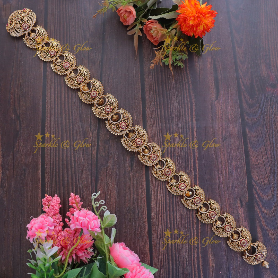 The hair accessory features intricate floral motifs that are reminiscent of classic Indian artistry, finished in a luxurious gold tone. Each piece is crafted with precision, ensuring durability and a sophisticated appearance.