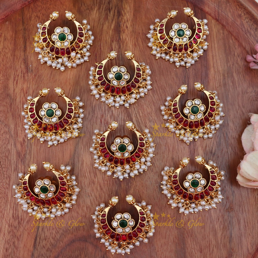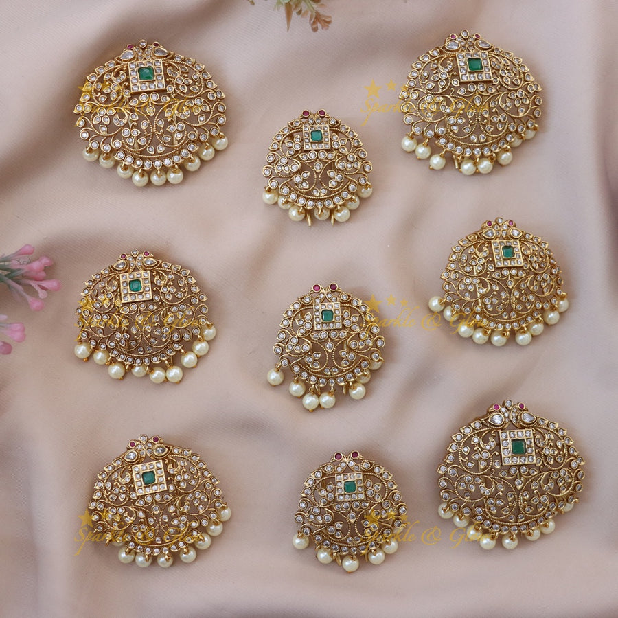 Whether you choose the Lakshmi Jadau Half Moon Hairpins or the Floral Jadabilla Hairpieces, each accessory is designed to help you feel special. The antique gold tones and pearl details add a vintage touch that complements sarees, lehengas, and Indo-Western outfits beautifully.